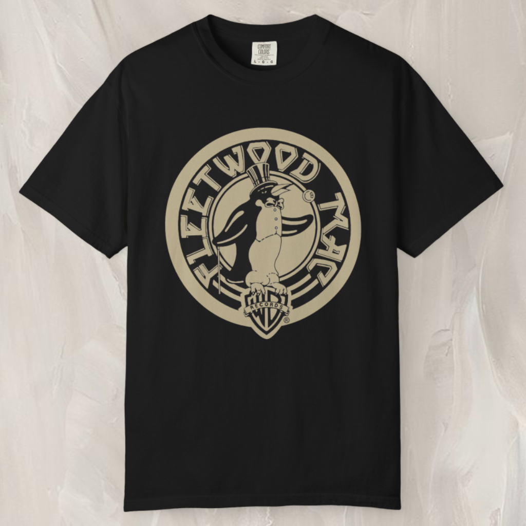 Encircling the penguin, the name Fleetwood Mac is printed in an arched layout that follows the curve of the design, giving the shirt a dynamic, flowing energy. The typography is styled to reflect the tour’s vintage character, nodding to the Tusk era’s experimental spirit and the band’s creative evolution during that time.