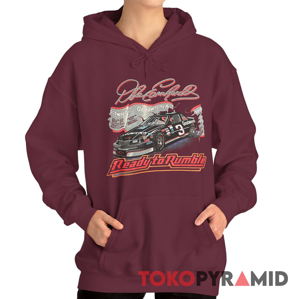 The design of this NASCAR T-shirt captures the essence of that historic year. At its center, the image of Earnhardt’s racing car stands tall, representing his dominance on the track and his unwavering determination. Above the car, the elegant curves of the name “Dale Earnhardt” are intricately woven, paying homage to the man who fearlessly pushed the limits of racing. Below the car, the bold proclamation of Ready to Rumble takes the spotlight, showcasing the thrilling fusion of NASCAR racing and the intensity of wrestling.