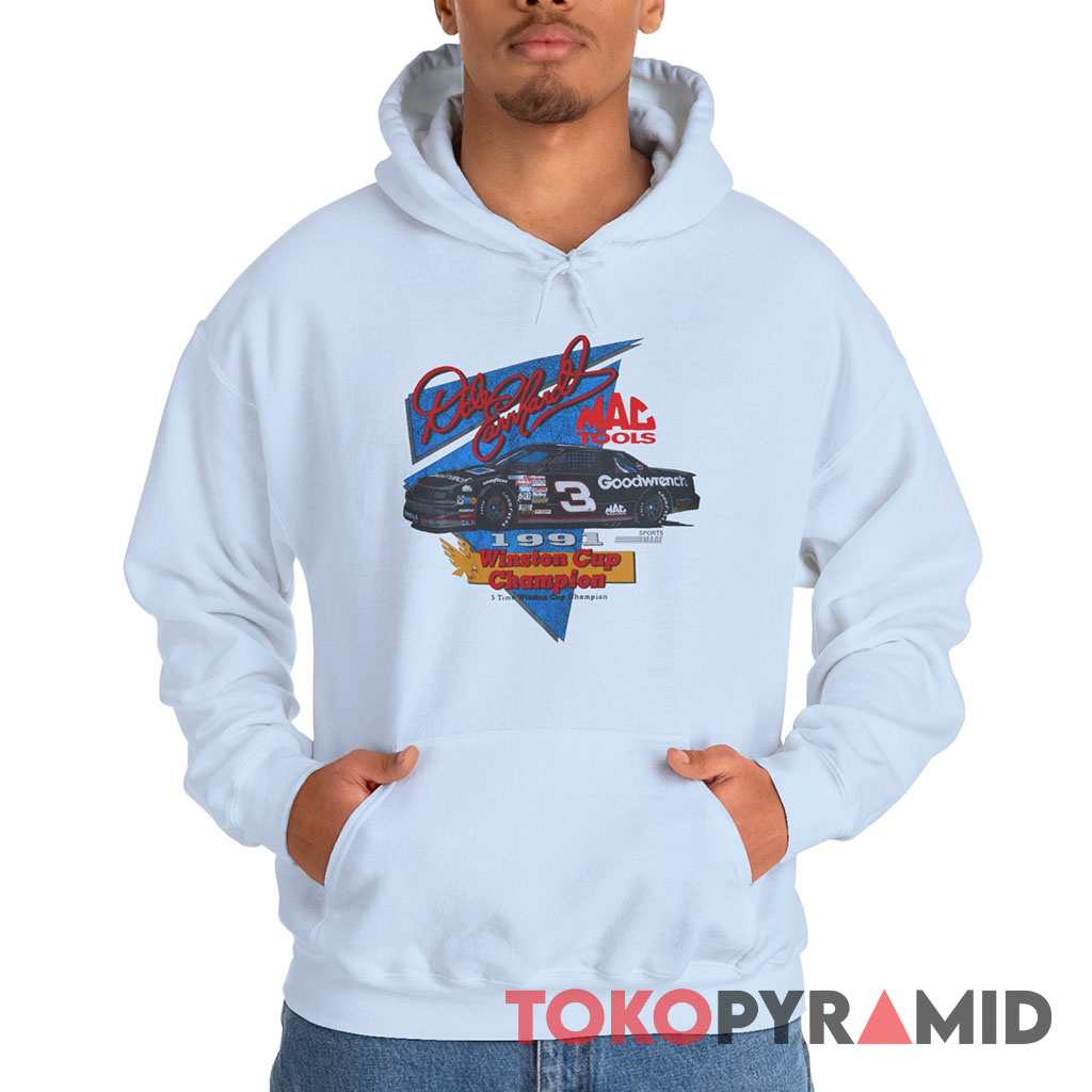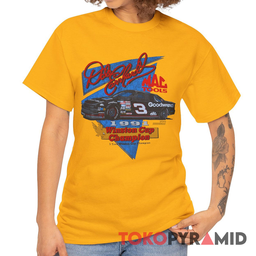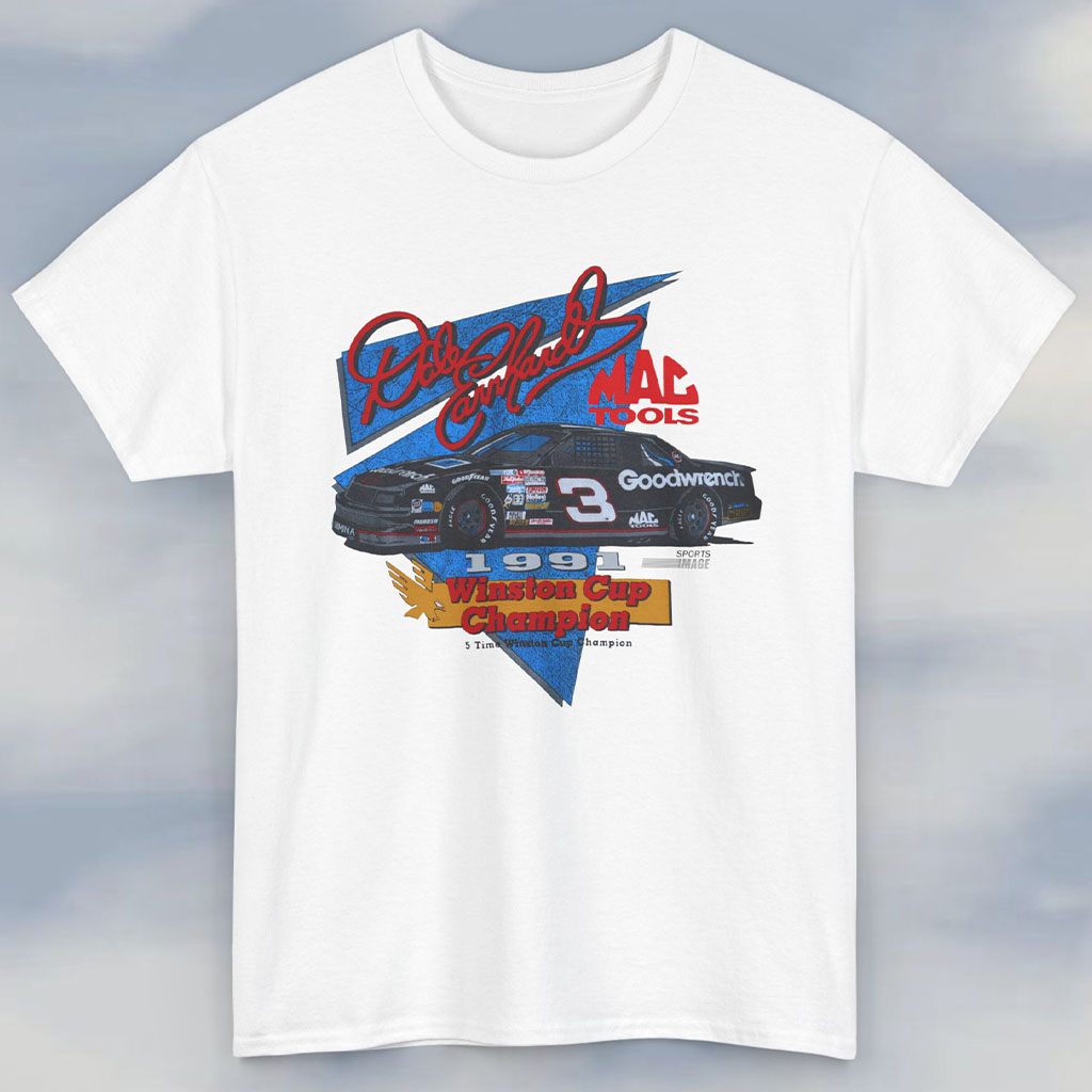 Adorning the shirt is a striking image of Dale Earnhardt’s racing car, a symbol of his dominance on the racetrack. The elegantly flowing Dale Earnhardt inscription above serves as a reminder of his lasting legacy, while the bold “1991 Winston Cup Champion” statement below underscores his triumph.