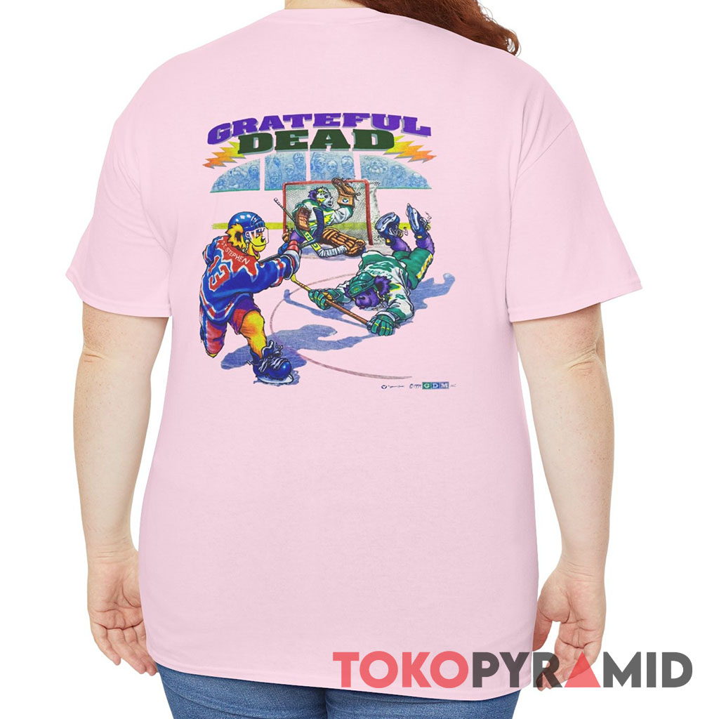 On the front side of the shirt, a captivating scene unfolds with three bears engaged in a spirited game of conga line. Amidst them, a bear dons the role of a goalkeeper, adding a playful twist to the traditional sport. Above the bears, the iconic “GRATEFUL DEAD” lettering stands bold and prominent, inviting you to explore the captivating world within the design. The audience watching this unconventional match is composed of bears and skeletons, representing the eclectic and diverse fan base of the band.