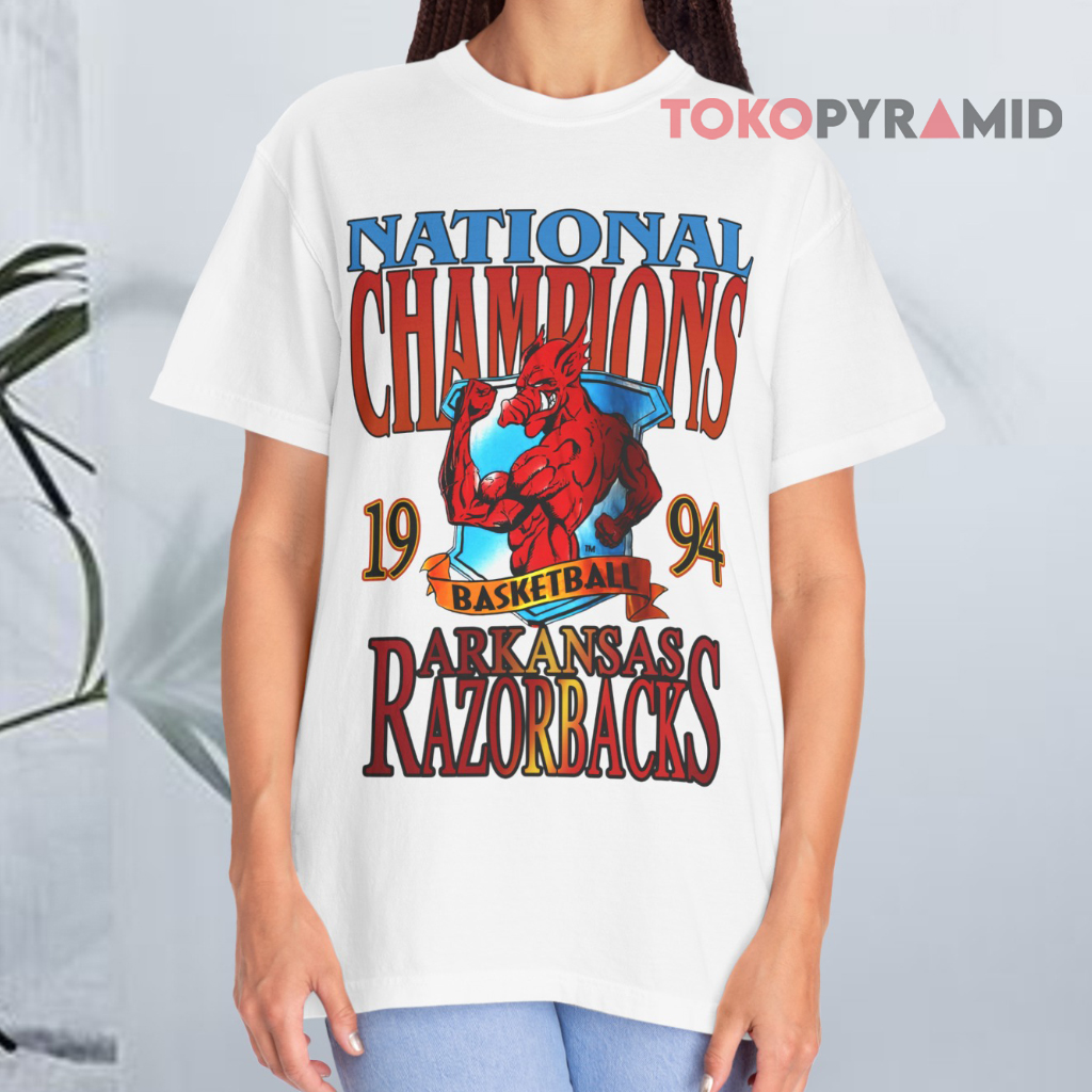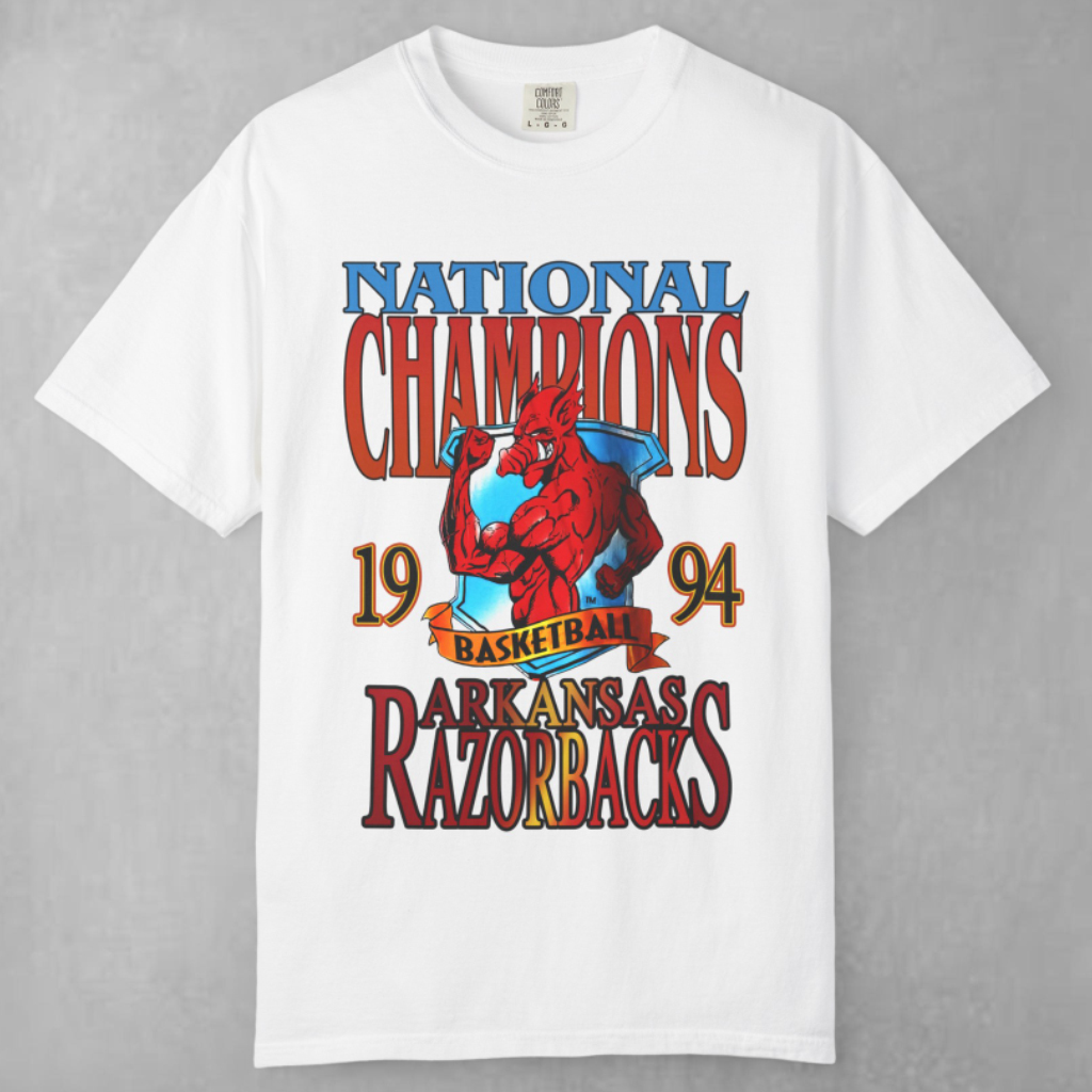 Beneath the artwork, “Arkansas Razorbacks” anchors the design, tying the entire look together with school pride. Whether you were there for the championship run or you’re a new fan honoring Razorbacks history, this shirt delivers iconic throwback energy. Perfect for game days, tailgates, or your retro sports collection, it’s more than just a tee — it’s a tribute to a title-winning legacy.