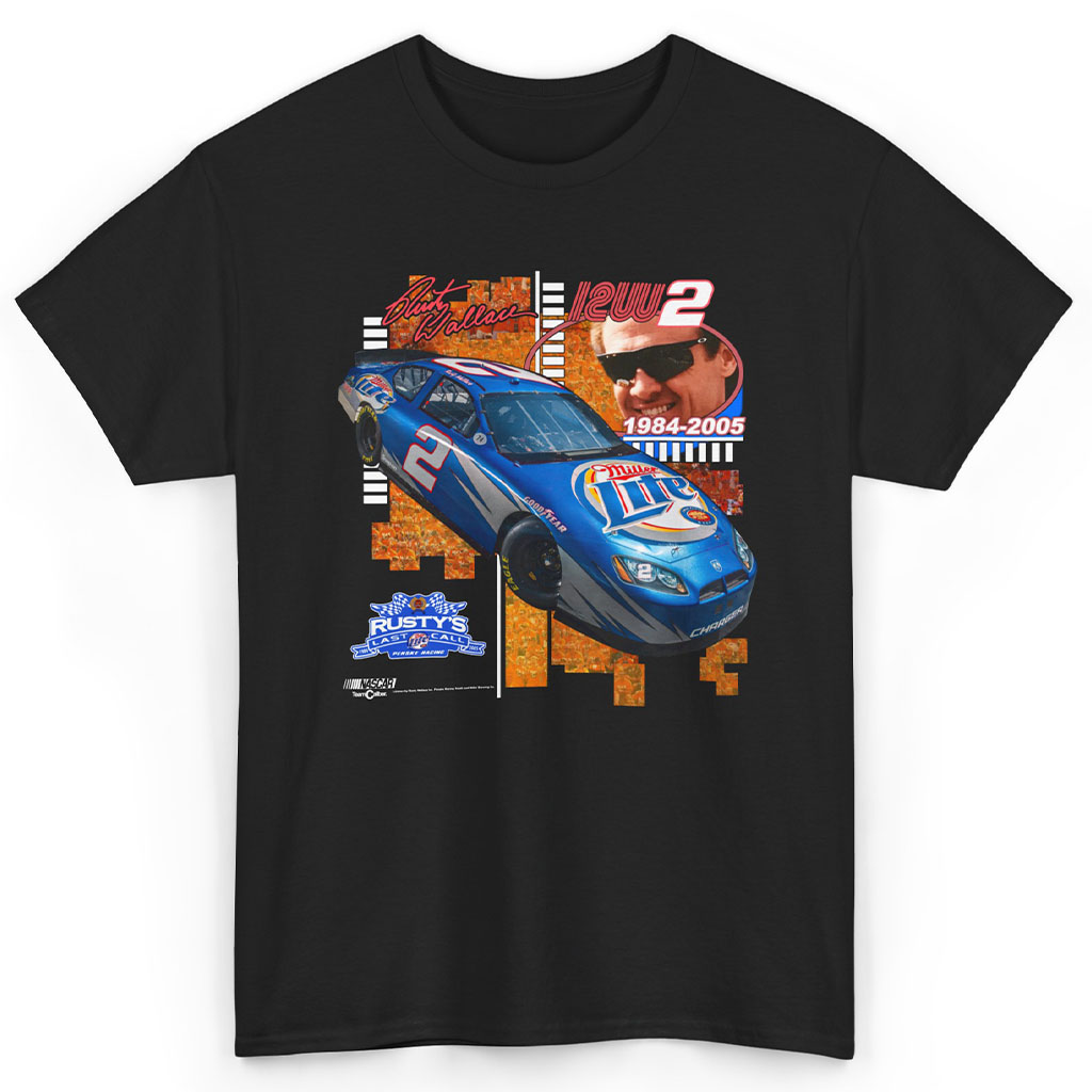 This Rusty’s Last Call Penske Racing T-shirt is a wearable tribute to Rusty Wallace’s incredible journey through the world of NASCAR. At its heart is the legendary #2 race car, adorned with the iconic Miller Lite sponsorship logo, emblematic of Rusty’s partnership with one of the sport’s most recognizable brands. It’s a symbol of the high-speed artistry that Rusty brought to the racetrack.