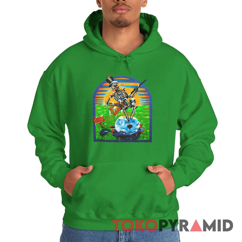 The front of the shirt features a skeleton standing on a grassy field, holding a broom and a guitar, with a wooden sign nearby. At the top, the words “I NEED A MIRACLE” are boldly displayed, capturing the sense of hope and anticipation that characterized the Grateful Dead’s concerts. Behind the skeleton, a radiant sun shines brightly, symbolizing the positive vibes and euphoria that the band’s music brought to their fans.