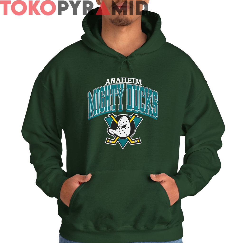 Beneath the prominent text lies the iconic Mighty Ducks logo: the fierce duck goalie mask set against a teal triangle, crossed by yellow hockey sticks. The graphic strikes a perfect balance between sharpness and nostalgia, embodying the fearless energy that made the team and its branding a cultural phenomenon. Every element — from the bold outlines to the structured layout — has been carefully rendered to preserve the unmistakable look of vintage sportswear.
