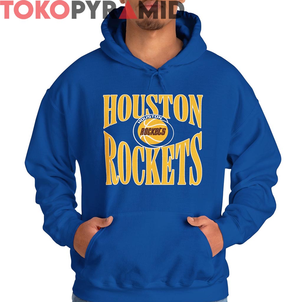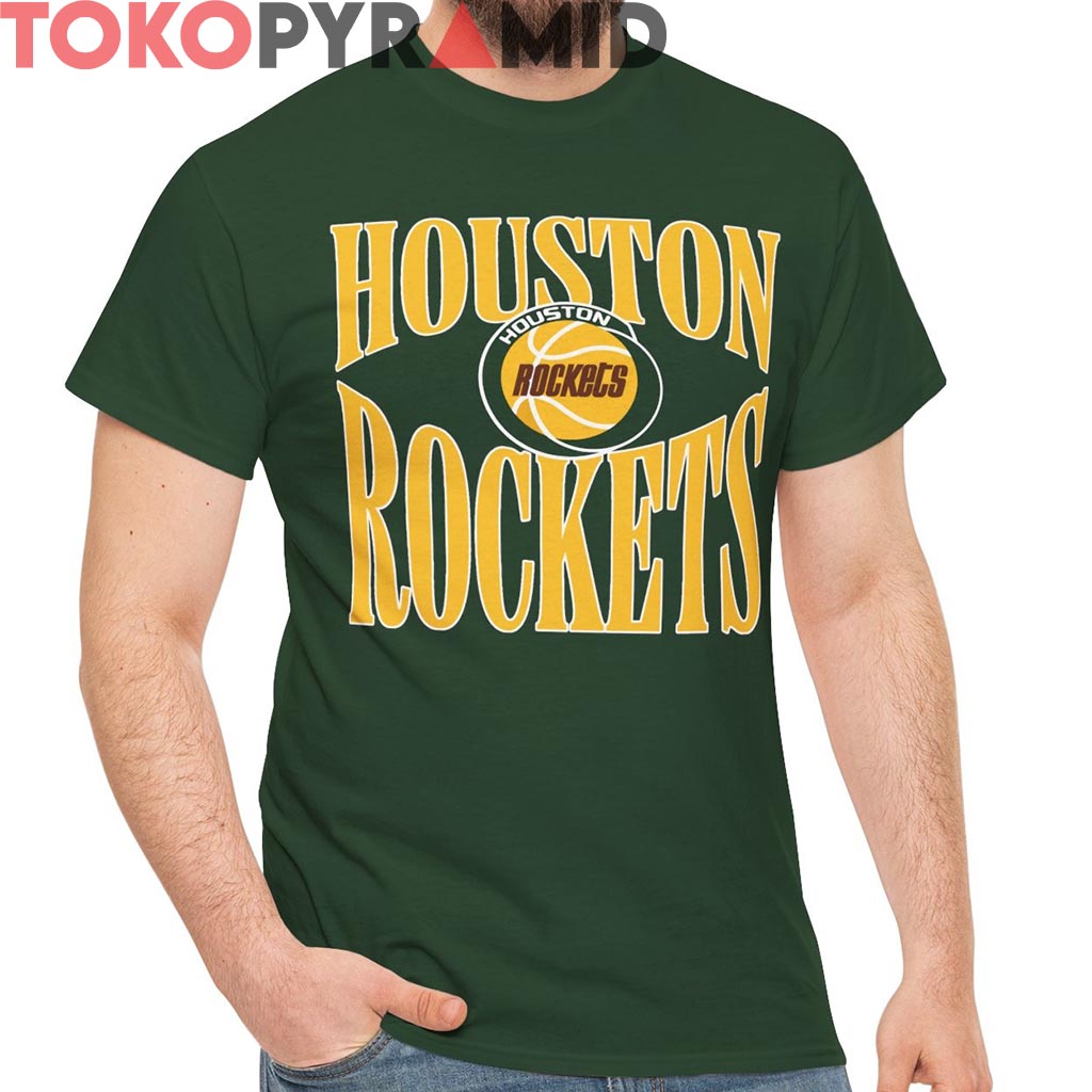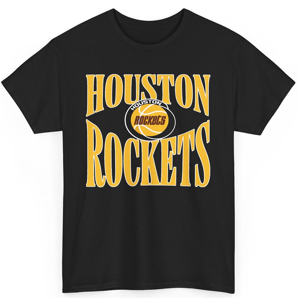 This shirt leans hard into its typography game, making the team name itself the ultimate statement. The scale, the symmetry, and that signature ‘90s block-font style all combine to bring major locker-room vibes—like something you’d see courtside at The Summit, worn by diehards repping the Clutch City era.