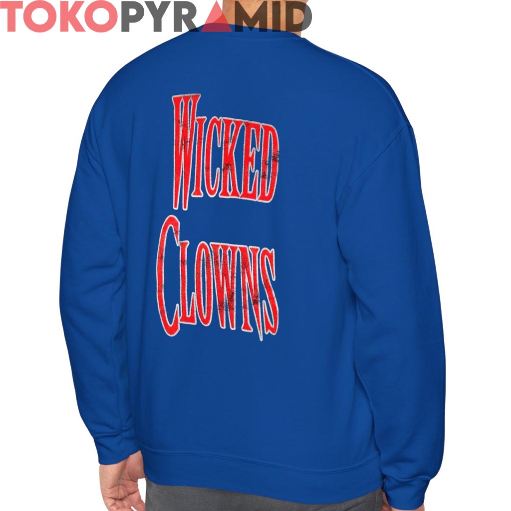 Above the scene, INSANE CLOWN POSSE blasts across in bold blood-red, old-school serif font—clean, commanding, and impossible to ignore. But the real gut-punch comes from the back: a towering WICKED CLOWNS logo, all caps, clawing down the spine of the shirt in blood-spattered red and bone-white. It’s a tribute to the era when ICP wasn’t just a band—they were a movement that flipped the music world the bird and created their own reality.