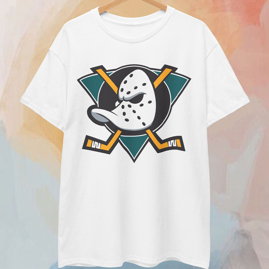 The Vintage Anaheim Mighty Ducks Logo Shirt captures the essence of 90s sports design with a bold, graphic-forward aesthetic that demands attention. Dominating the layout is the unmistakable goalie mask logo — a fierce duck-billed helmet, punctuated by angular lines and set in front of two crossed hockey sticks. Below it, the familiar teal triangle provides a sharp contrast that draws the eye and gives the print its signature Mighty Ducks flair.