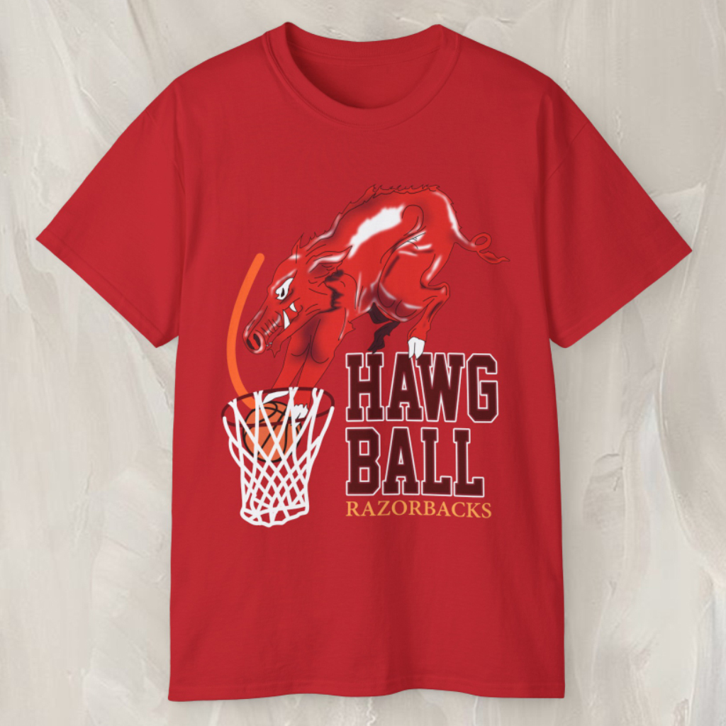 Centered on the shirt is the powerful text “Hawg Ball Razorbacks”, perfectly complementing the illustrated mascot. The typography is strong, athletic, and energetic, creating a sense of motion and excitement. The layout is well-balanced, allowing the graphic to pop while reinforcing the team’s identity. Whether you’re courtside or watching from home, this design ensures your Razorbacks pride is loud and clear.