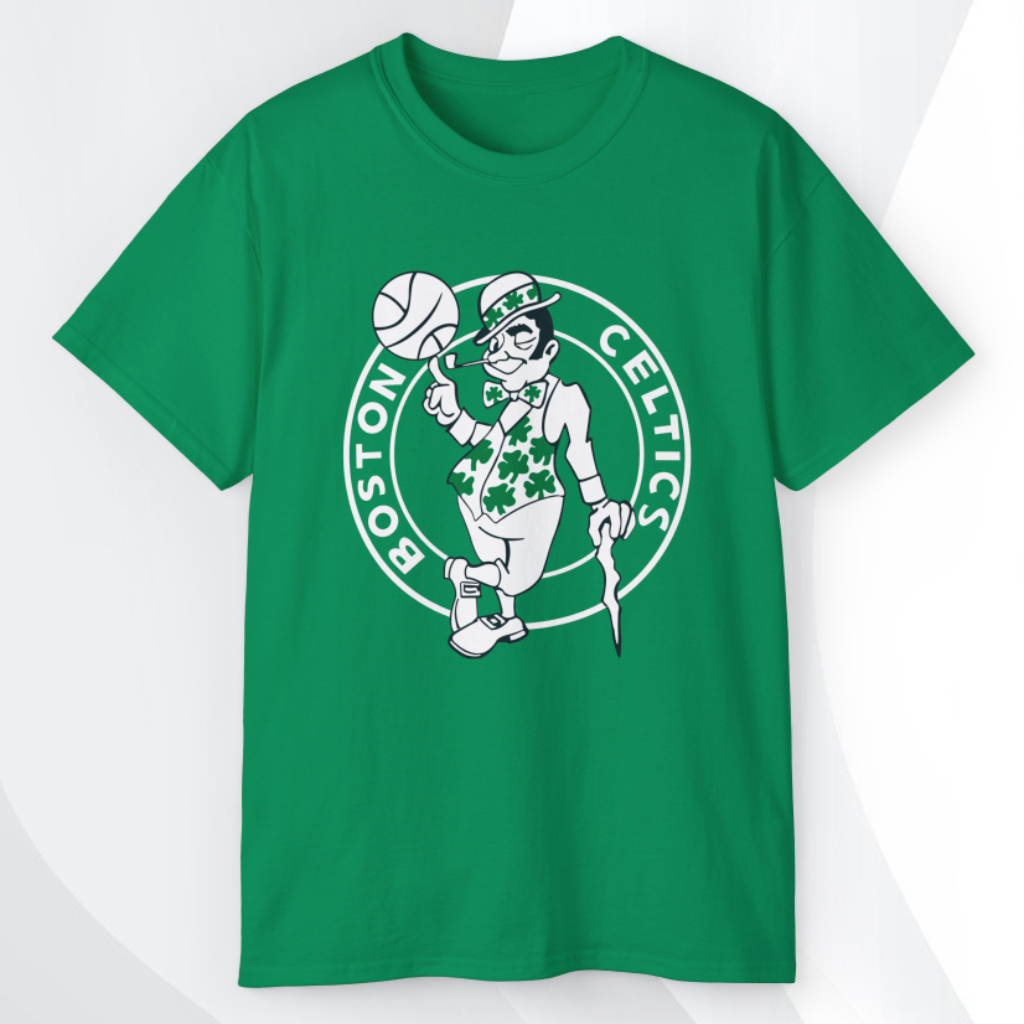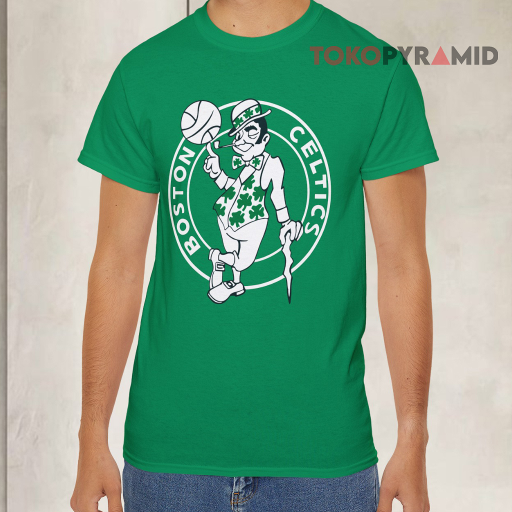 Celebrate iconic basketball heritage with the Boston Celtics Logo NBA Basketball Shirt, a standout piece that pays tribute to one of the most storied franchises in the NBA. The centerpiece of this design is the instantly recognizable Celtics logo—an illustrated gentleman confidently leaning on a cane with a basketball in hand, dressed in classic Celtic attire including a clover-covered vest. This classic image radiates charm, tradition, and unmistakable team pride.