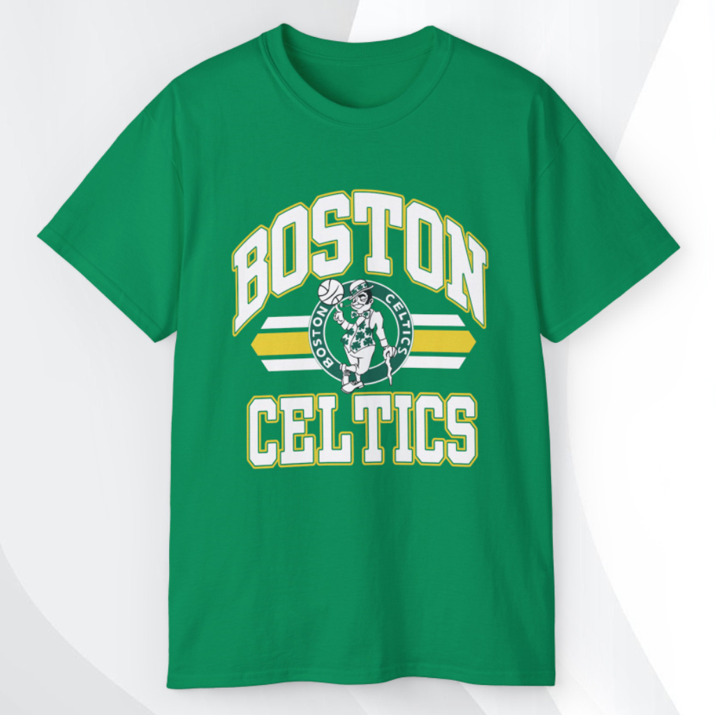The front design centers around the classic Boston Celtics logo, showcasing the signature leprechaun spinning a basketball, framed by crisp lines that create a dynamic visual flow. The surrounding design incorporates vintage stripes, adding texture and movement that captures the energy of 1980s basketball aesthetics. The word “Boston” stands proudly above the logo, while “Celtics” anchors the design below in a sharp, retro font.