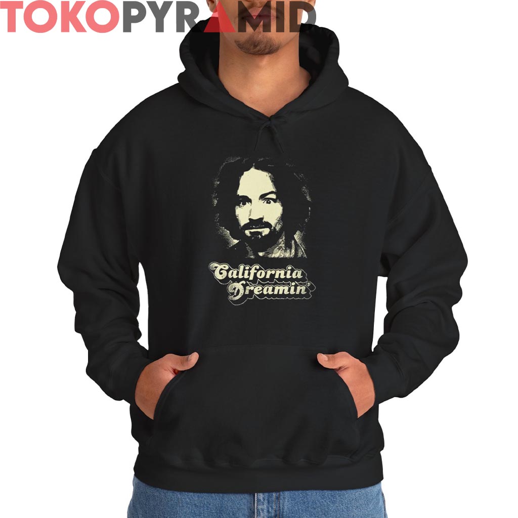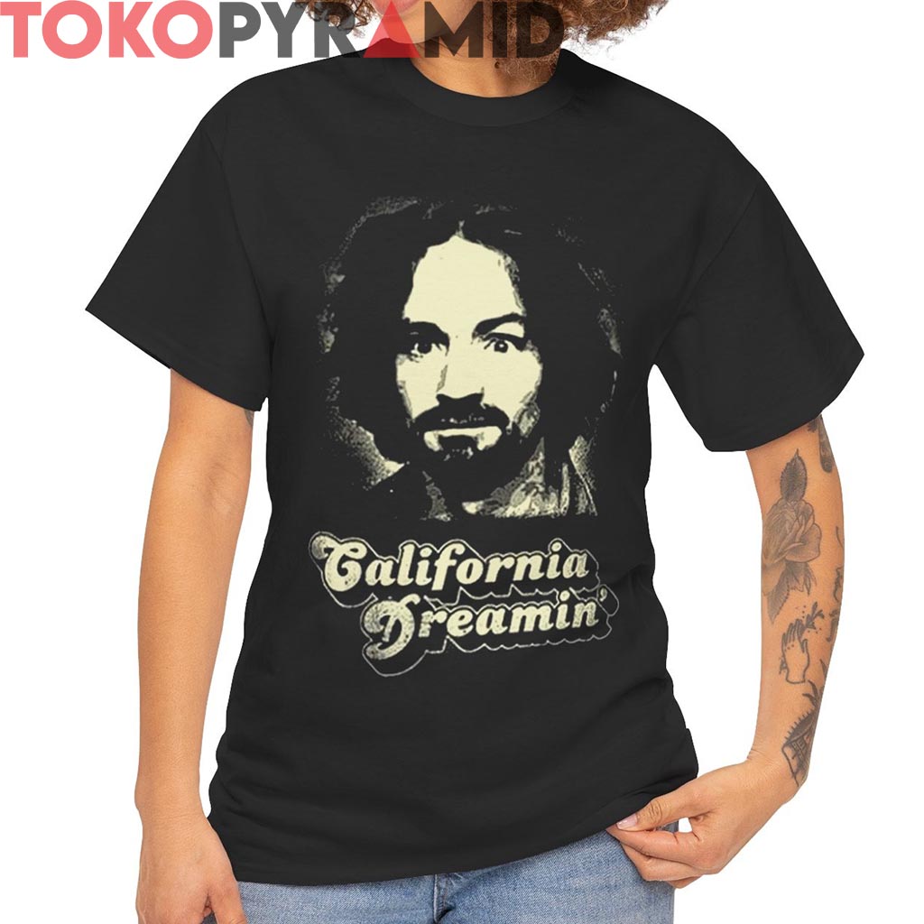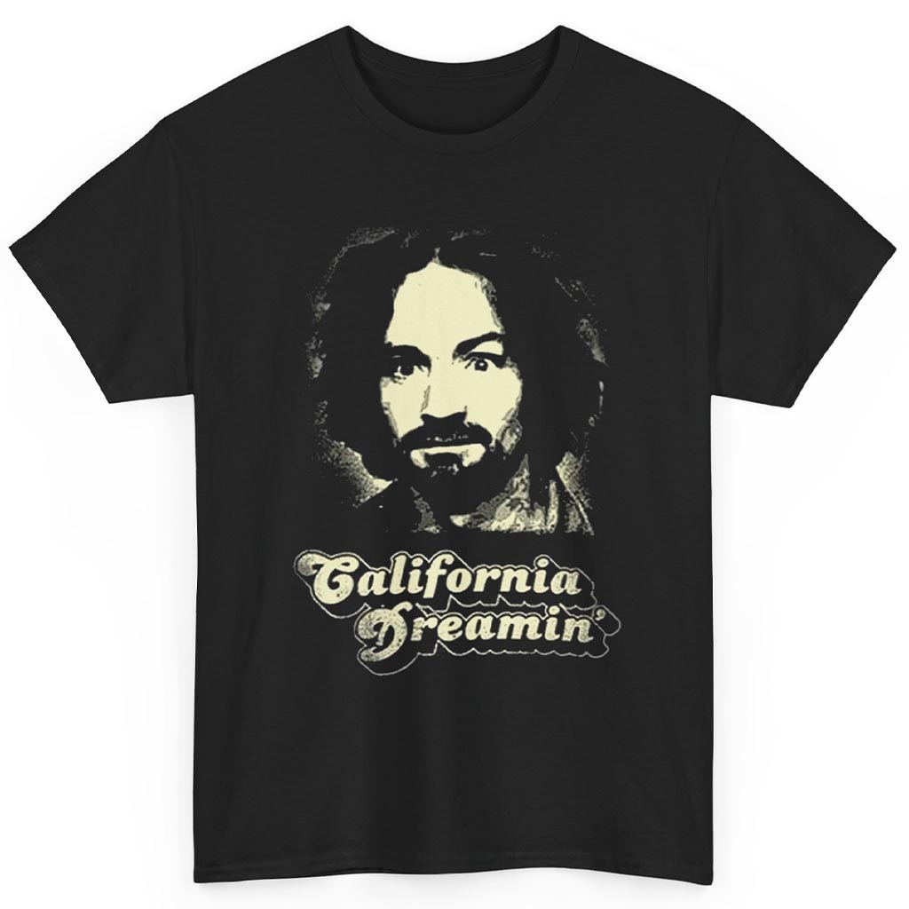 Charles Manson California Dreamin’ Shirt, vintage Charles Manson shirt, California retro graphic tee, 60s counterculture shirt, grunge streetwear t-shirt, Manson portrait shirt, psychedelic dark shirt, retro California tee, cult aesthetic apparel, edgy graphic t-shirt, vintage rock shirt, underground fashion tee, haunting retro style shirt, classic rock era shirt, California Dreamin graphic tee, pop culture irony t-shirt.