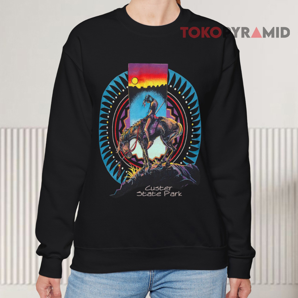 Capture the quiet beauty of the American West with the Vintage 90s Custer State Park Horses Shirt. The design centers around a nostalgic illustration of a lone rider and horse, both depicted in a gentle, weary stance that evokes a deep sense of calm and connection to nature. Framed by a softly painted backdrop of the sun peeking over the landscape, the artwork radiates a peaceful, almost cinematic quality.