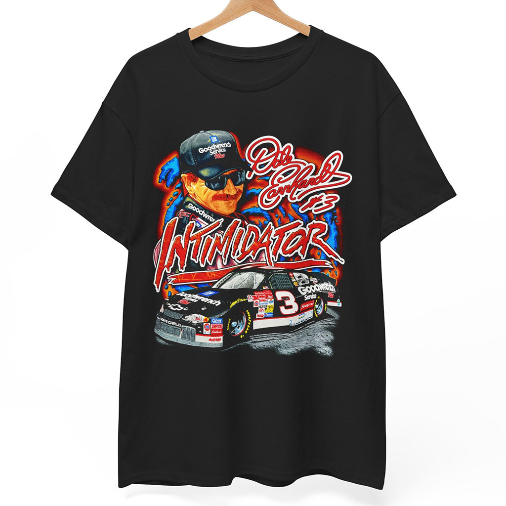 I have a Nascar Vintage T-shirt featuring the image of Nascar’s legendary Dale Earnhardt, labeled Dale Earnhardt 3 Intimidator Goodwrench T-shirt. Dale Earnhardt, one of NASCAR’s most iconic racers, is renowned by the moniker “The Intimidator”. This nickname reflects his fearless and powerful driving style, always confident and unyielding in the face of challenges. With his strong and resolute demeanor on the racetrack, Earnhardt solidified himself as an unbeatable and awe-inspiring driver. The moniker “Intimidator” became an integral part of his legacy.