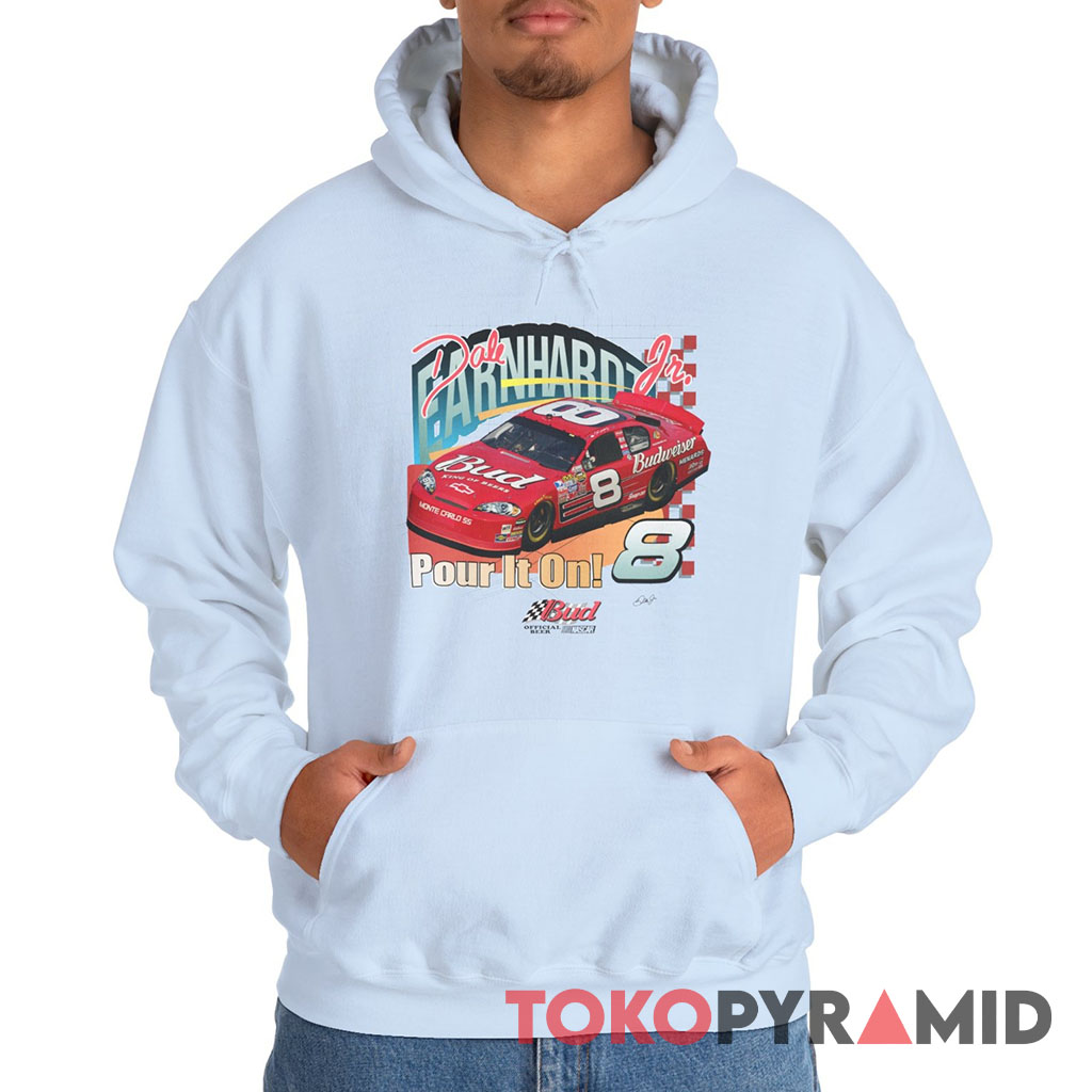 Emblazoned on this t-shirt is an image of his signature race car, proudly displaying the number 8, which has become a symbol of Dale Earnhardt Jr.’s racing prowess. Throughout his journey, he achieved remarkable success, and his affiliation with Budweiser as a prominent sponsor further added to his appeal. The Budweiser logo on the car serves as a testament to their collaboration and the tremendous impact it had on Dale Earnhardt Jr.’s racing career.
