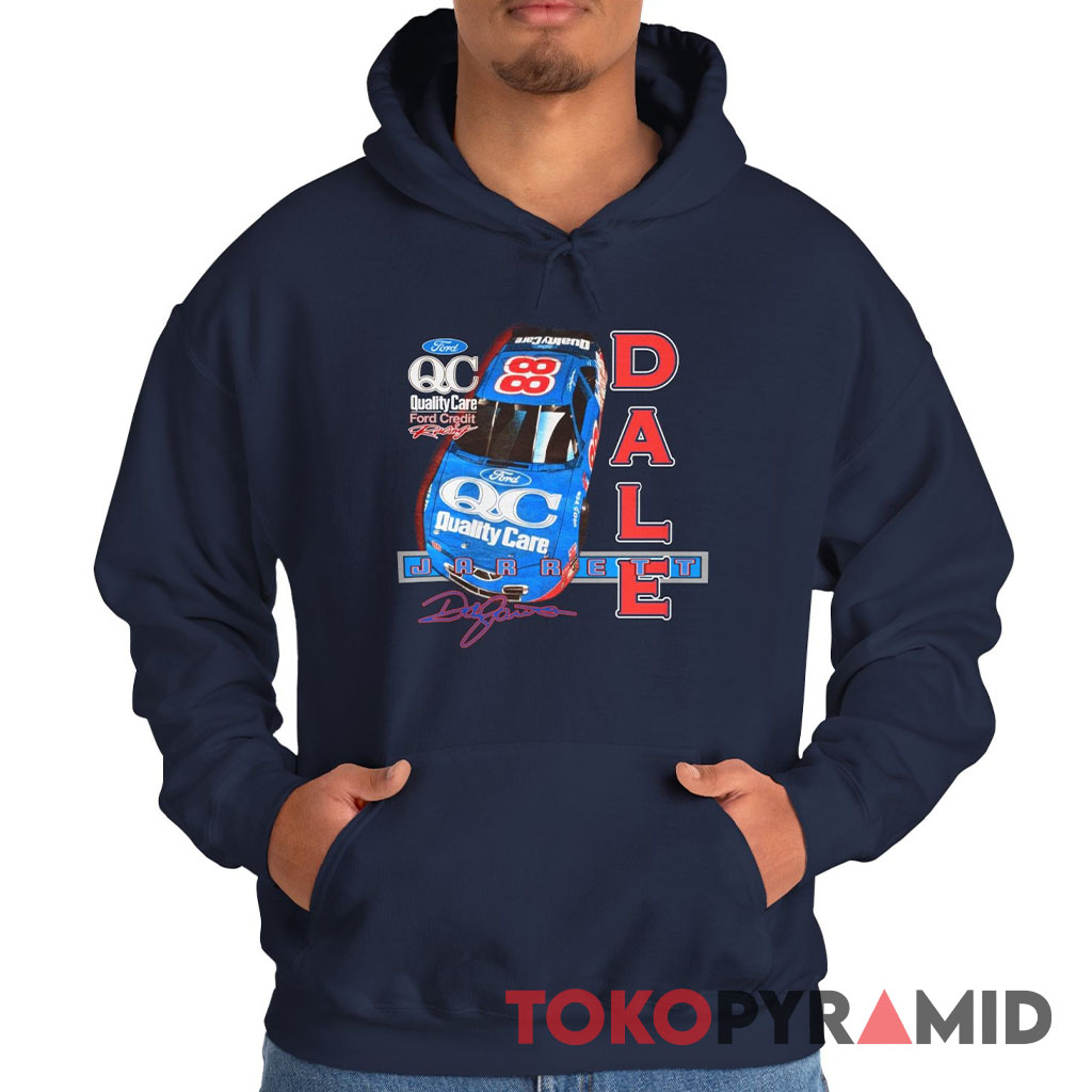 The Nascar Dale Jarrett Quality Care Ford Credit Racing T-shirt features a tribute to Dale Jarrett, an accomplished American race car driver who made his mark in the NASCAR racing world, becoming one of its most renowned stars. During his racing career, Quality Care Ford Credit played a significant role as one of the primary sponsors for Dale Jarrett.