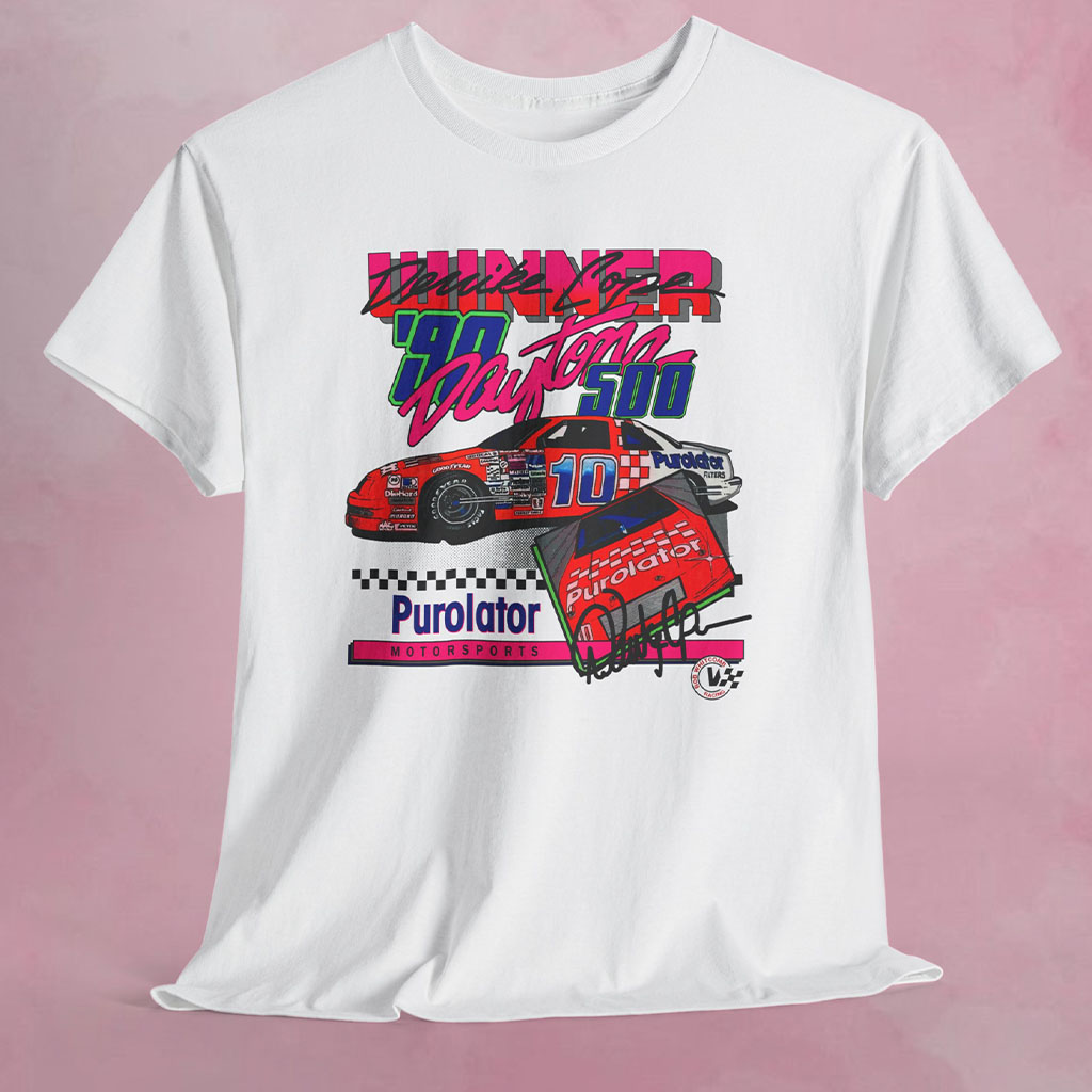 The Nascar Derrike Winner T-shirt showcases a vivid depiction of the car’s overall design, capturing the essence of Derrick Cope’s triumphant victory. The number 10 car is prominently displayed, showcasing the eye-catching “Neon” branding and the distinctive sponsor logo of Purolator. The detailed image of the car’s front end adds a dynamic touch to the design, reflecting the speed and excitement of the race.