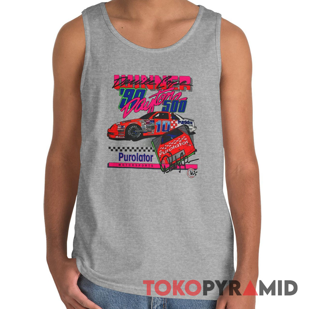Above the car illustration, the words “Derrike Cope” are seamlessly intertwined with the word “Winner”, symbolizing his historic achievement at the Daytona 500. The race’s significance is further emphasized by the bold inscription of “Daytona 500 ’90”, marking the year of the victory. Below the imagery, the sponsor’s name “Purolator” is featured, solidifying the connection between the victorious moment and the support of the sponsor.