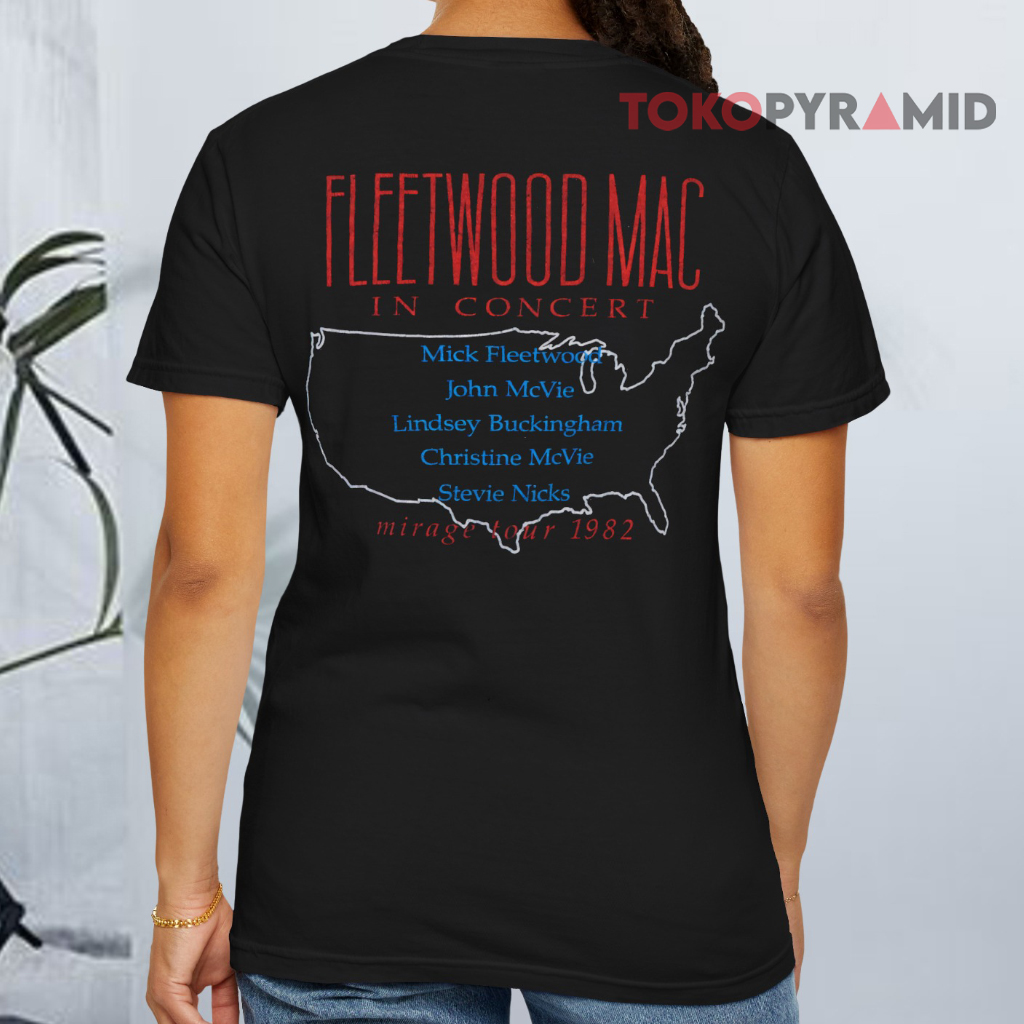 On the back, the design transforms into a tour-lover’s dream. A detailed map layout showcases various stops from the band’s 1982 Mirage Tour, with bold markings and subtle vintage tones. Above the map, the text “Fleetwood Mac in Concert” stands prominently, while below, “Mirage Tour 1982” completes the visual narrative, anchoring the shirt firmly in one of the band’s most celebrated touring years.