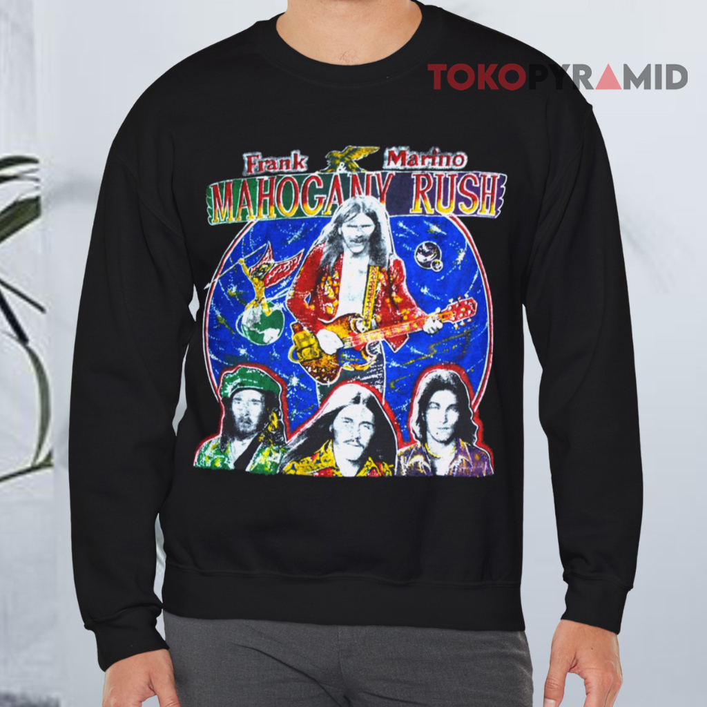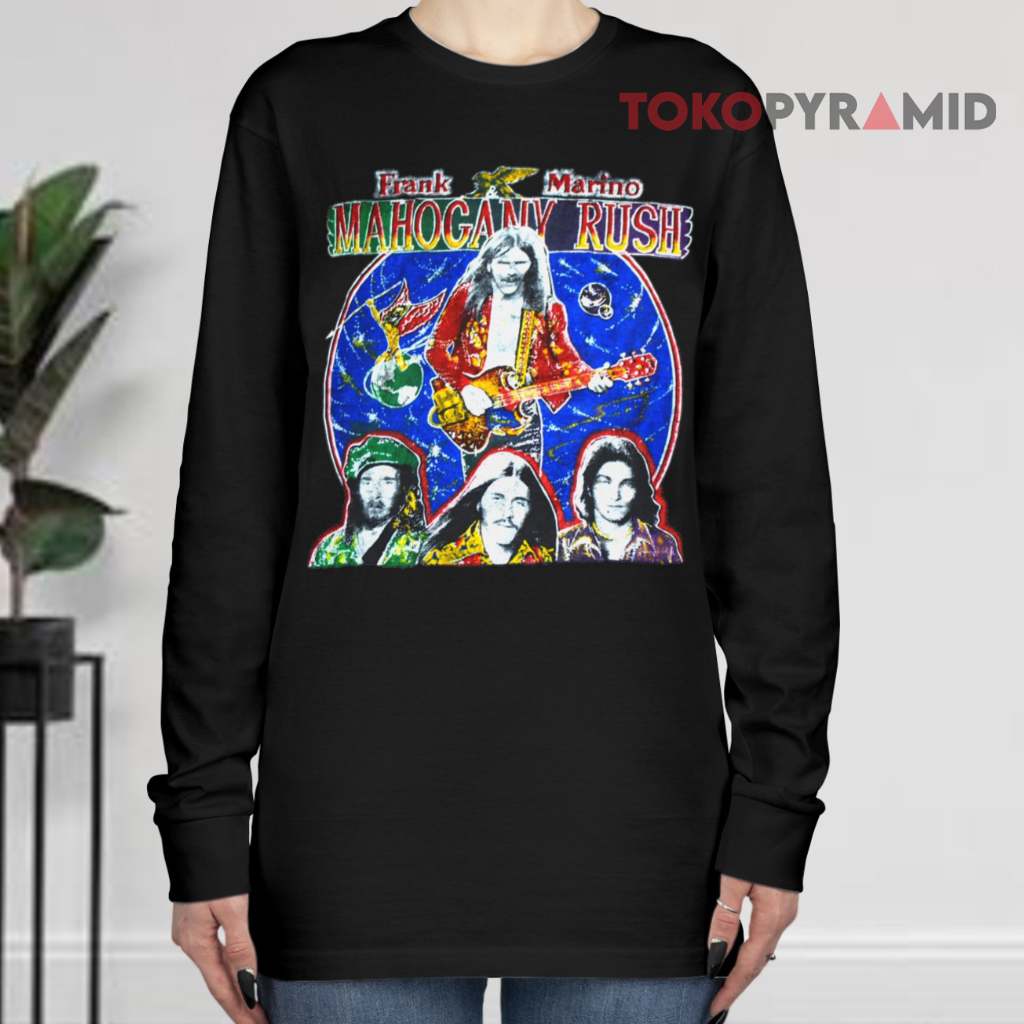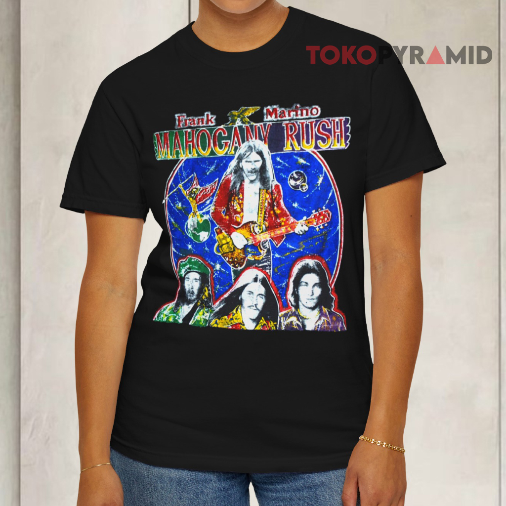 Above the central graphic, bold lettering spells out “Frank Marino Mahogany Rush,” establishing the shirt’s unmistakable connection to the legendary band. Beneath the main image, a lineup of familiar faces—band members past and present—adds depth to the artwork, making the shirt feel like a visual timeline of Mahogany Rush’s evolution. The design perfectly balances portraiture and typography, giving it a classic vintage tour vibe.