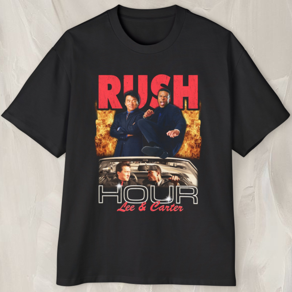 Above the action-packed graphic, the word “Rush” is boldly printed in a vintage-style font, evoking the raw energy and nostalgic feel of ’90s action movie posters. Just beneath the fiery duo, the text “Lee & Carter” is stamped in clean, sharp lettering — grounding the composition with a sense of identity and tribute to the unforgettable characters.