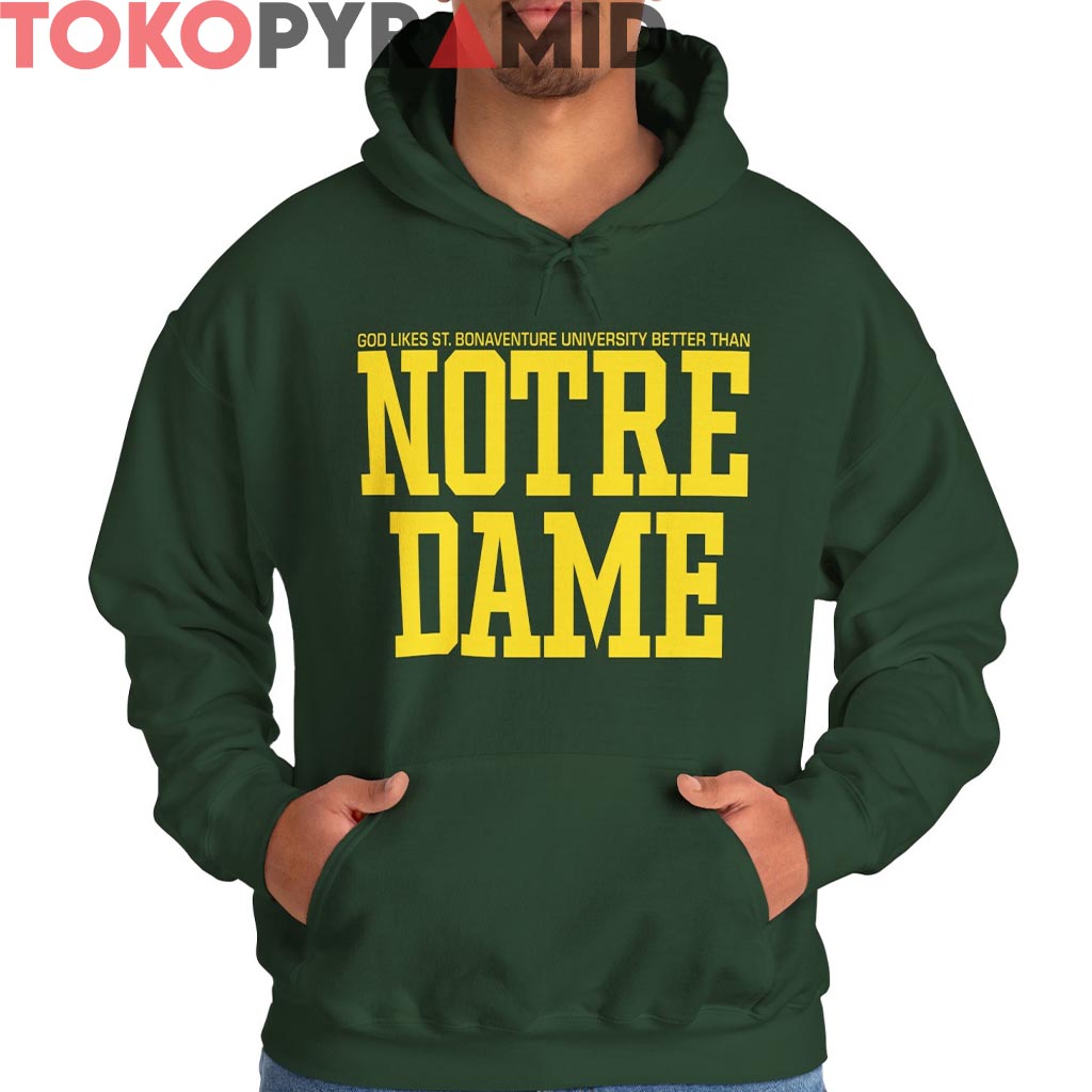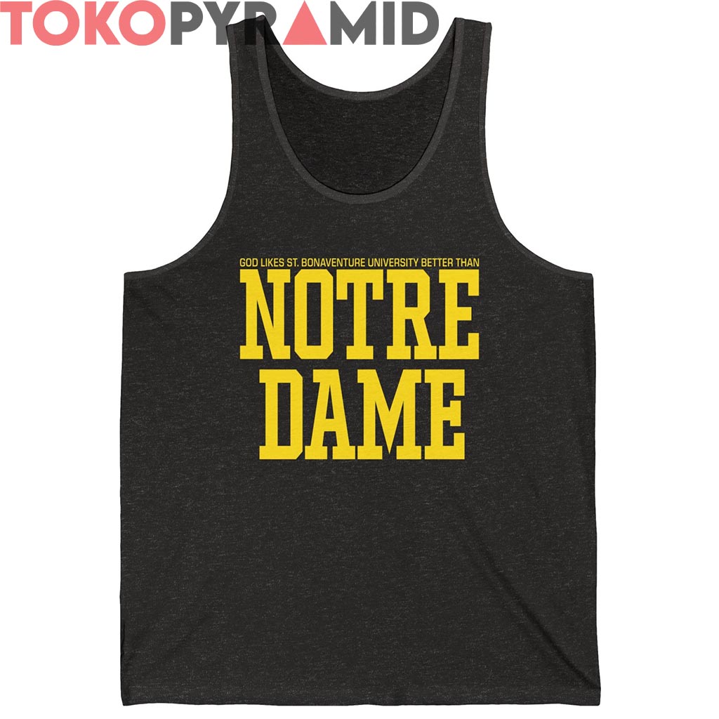 This shirt doesn’t whisper – it shouts. Front and center is the unapologetically massive “NOTRE DAME” text in bright yellow varsity-style block letters, the kind that would make any stadium wall jealous. But look closer – above it, a sharp jab lands perfectly: “GOD LIKES ST. BONAVENTURE UNIVERSITY BETTER THAN” – a line that drips with collegiate sass and deep-cut rivalry humor. It’s vintage smack talk in its purest form, straight from the bleachers of the ’80s or early ’90s.