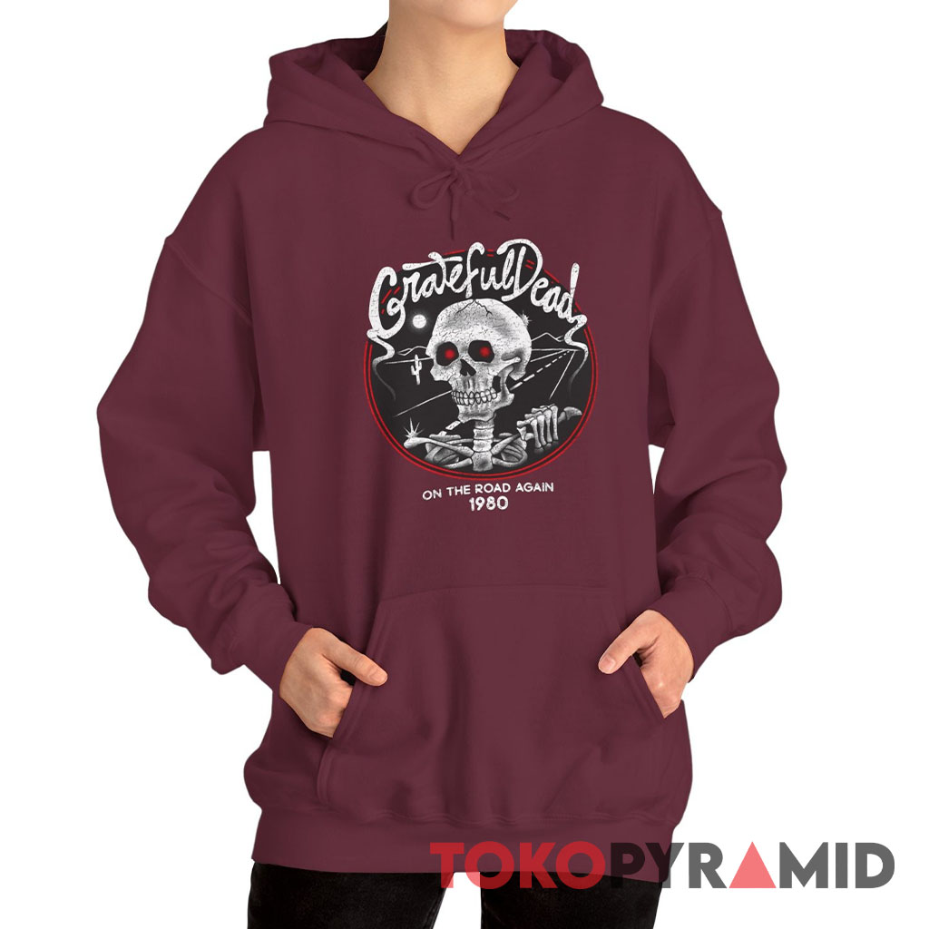 Below the central image, the words “ON THE ROAD AGAIN 1980” are written. These words carry significant weight for fans of the Grateful Dead, as they symbolize the band’s relentless dedication to touring and performing live for their devoted fan base.
