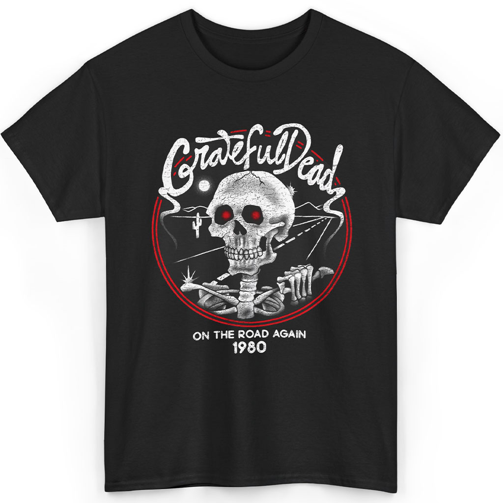 At the center of the shirt is a captivating image: a skeleton figure, the band’s iconic mascot, is depicted enjoying a cigarette. Behind this character unfolds a seemingly endless road, stretching into the horizon. The design is enclosed within a bold red circular frame. Above this image, proudly displayed, is the name of the band, “Grateful Dead”.