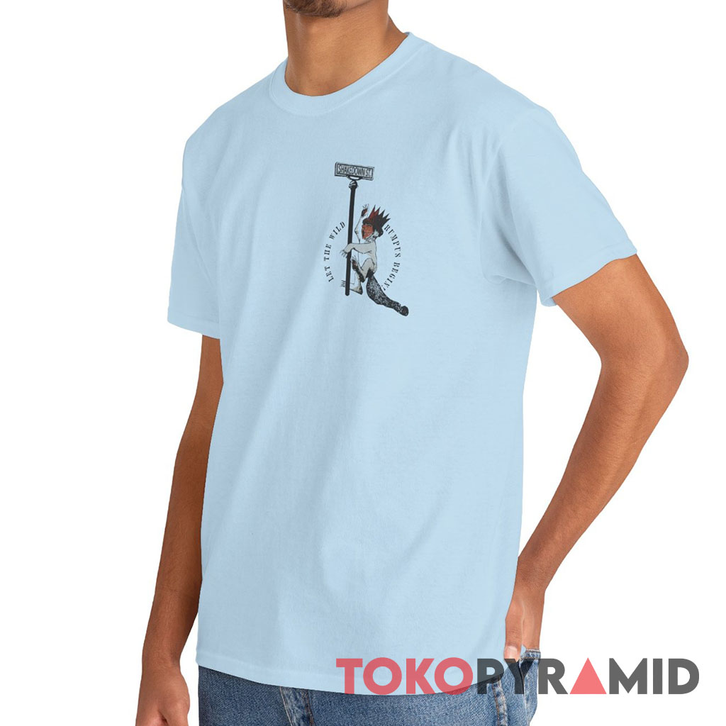 Front Design: At the heart of the shirt, a small but impactful illustration rests on the left chest area. Here, a crowned monkey, exuding an air of mischief, clutches a sign that reads “SHAKEDOWN ST.”. Encircling this playful monkey is the phrase “LET THE WILD RUMPUS BEGIN”, serving as an invitation to embrace the free-spirited nature of the tour.