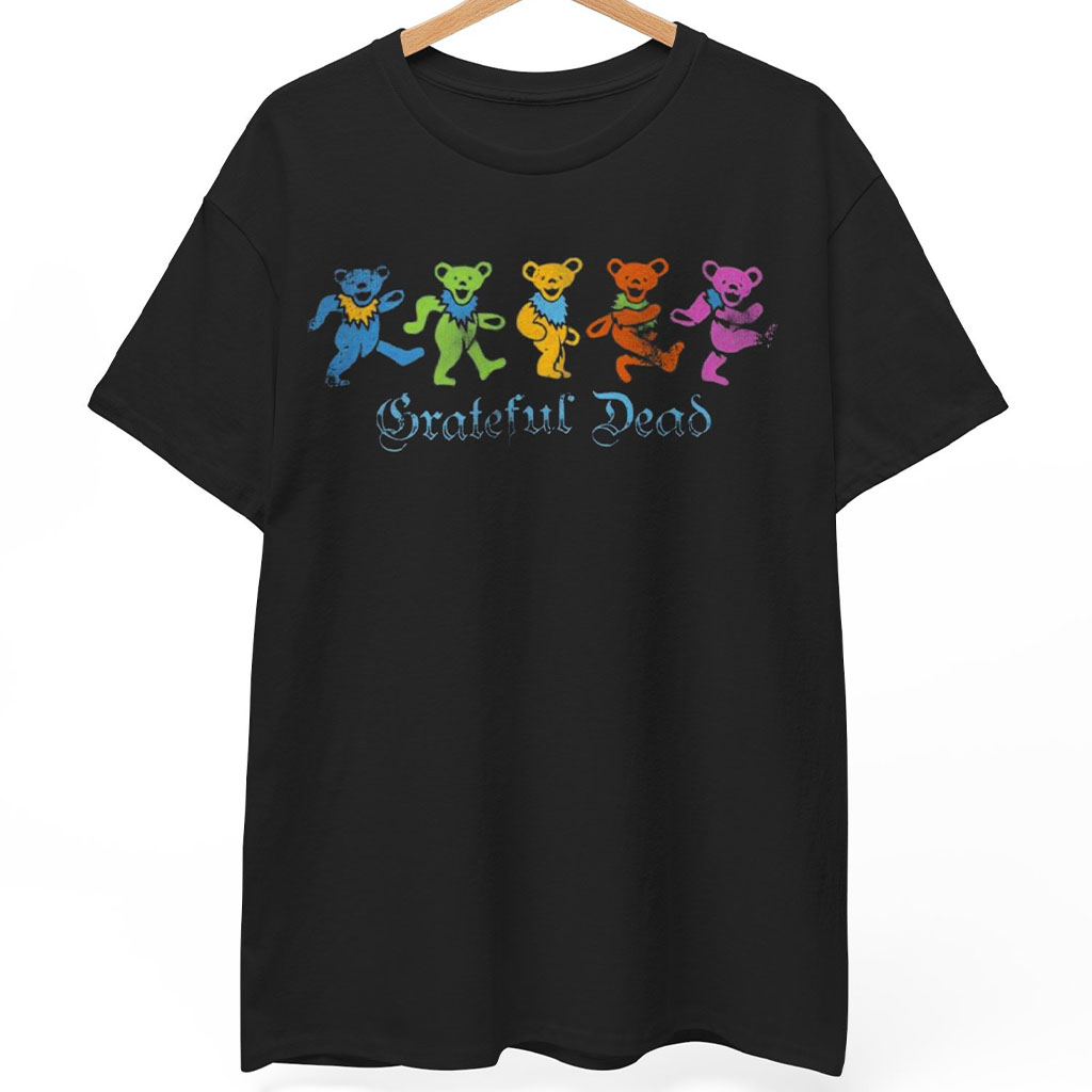 Introducing the Vintage Grateful Dead Dancing Bears Gothic Text Rare Shirt, a true testament to the iconic and beloved Dancing Bears imagery in the world of Grateful Dead fandom. This distinctive shirt showcases five vibrant Dancing Bears, each adorned in a unique color palette of blue, green, yellow, orange, and pink, each captured in their own joyful dance poses.