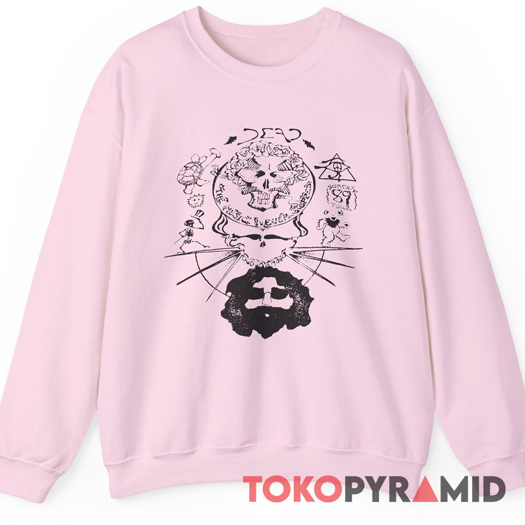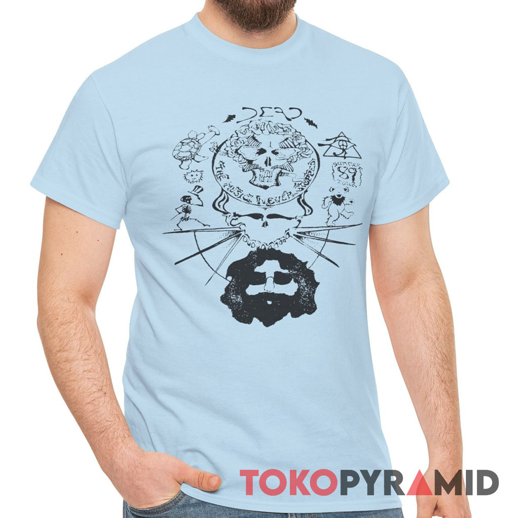 At the heart of this shirt, a captivating skull takes center stage, embodying the essence of the Grateful Dead’s music that truly never stopped. Above the skull, the powerful words “THE MUSIC NEVER STOPPED” resonate as a testament to the enduring legacy of the band.