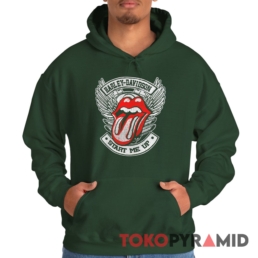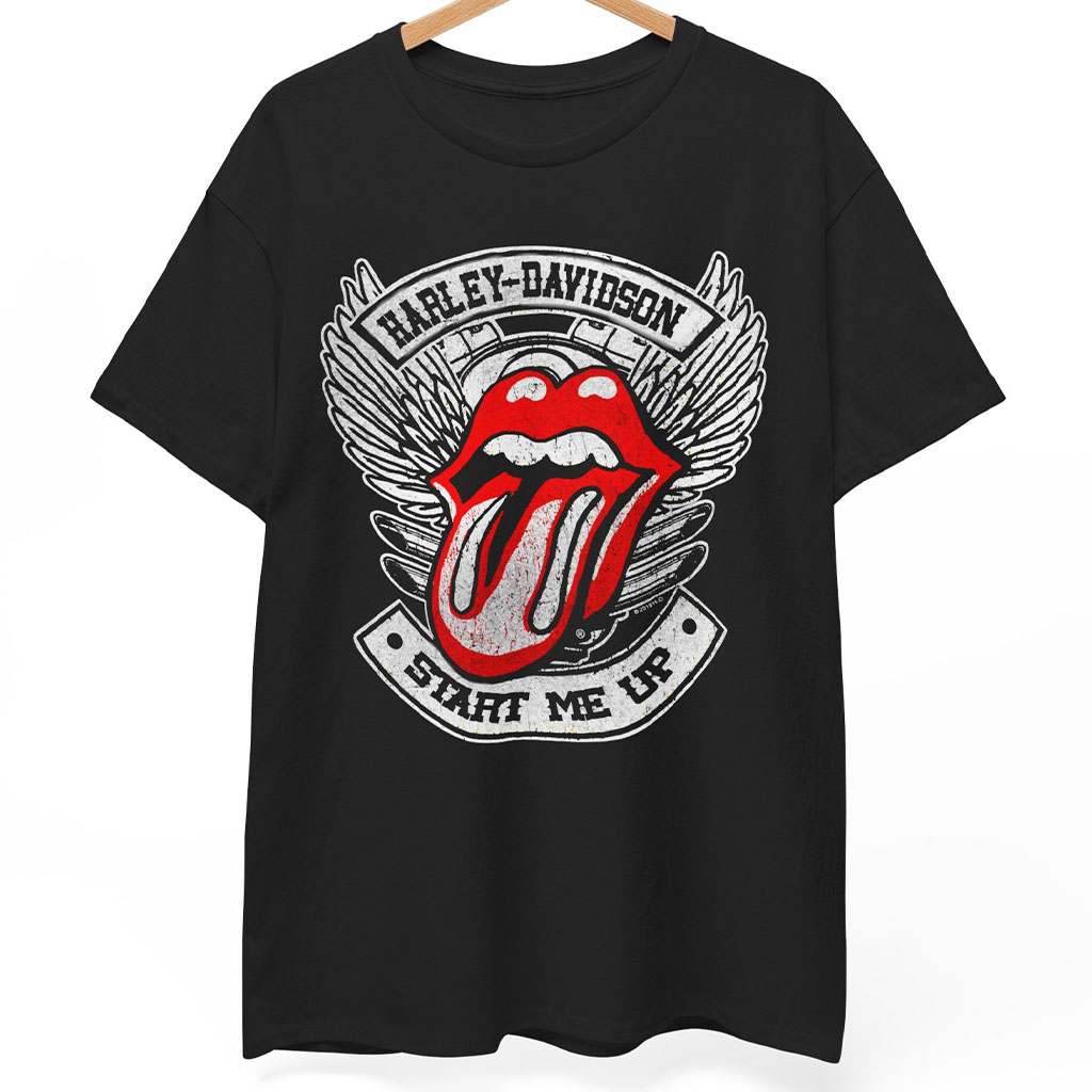 Adding to the allure, a banner featuring the distinctive “Harley-Davidson” emblem gracefully arches above the logo, emphasizing the partnership between these two iconic entities. Just below, the phrase “Start Me Up” is elegantly displayed, a nod to one of The Rolling Stones’ timeless hits and a sentiment that resonates with both the thrill of riding a Harley and the excitement of a live rock performance.