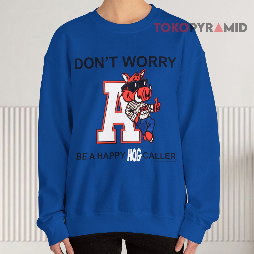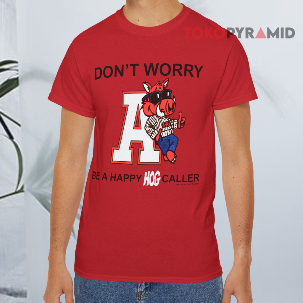 Above the graphic, the playful phrase “Don’t Worry” is printed in a cheerful, eye-catching font. Below, “Be A Happy Hog Caller” ties it all together, paying tribute to one of the most spirited traditions in college sports — the Hog Call. The design balances humor, pride, and Razorback identity in one lively layout that grabs attention and brings smiles.