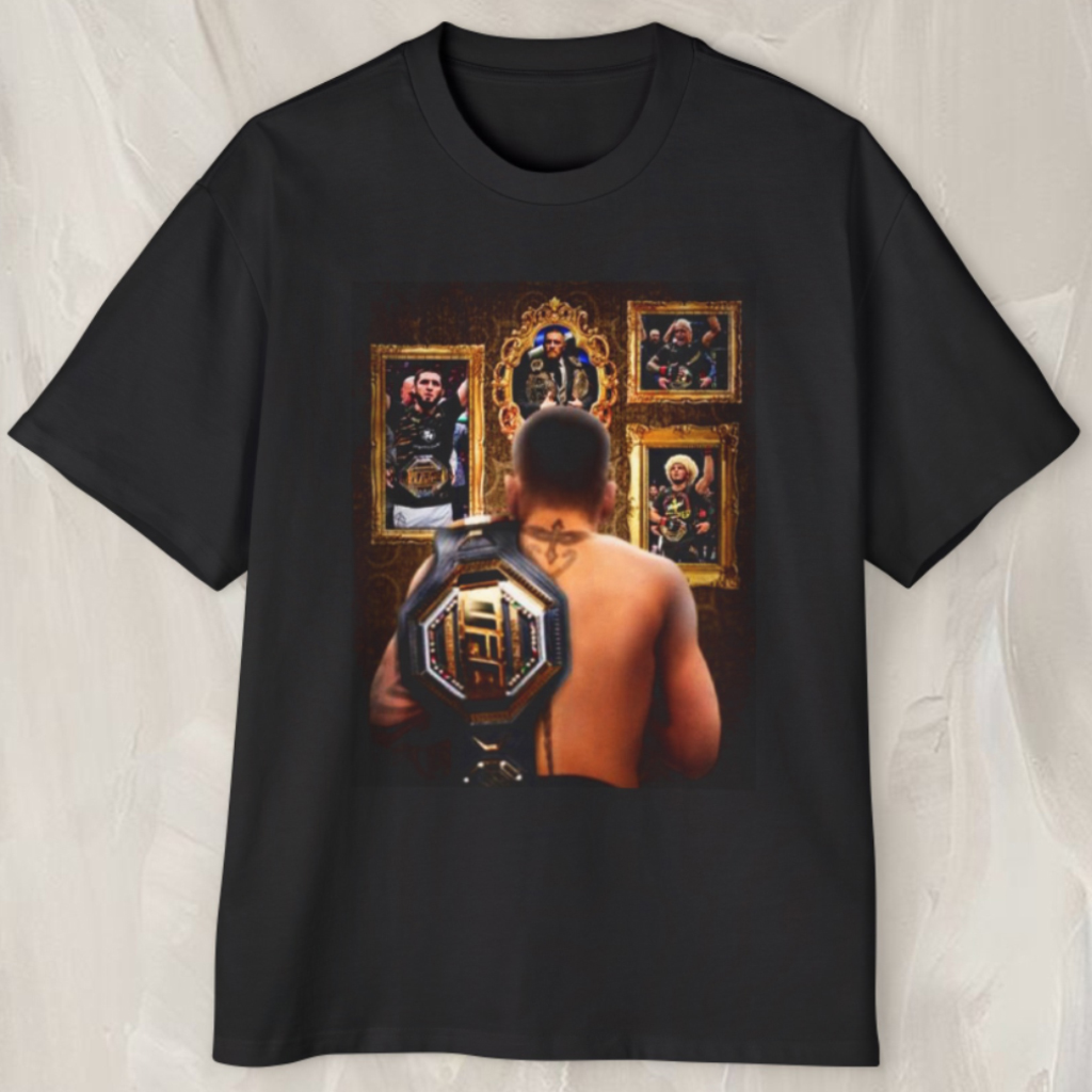 What makes this design stand out is the artistic scene in front of Topuria—he’s shown observing a wall of painted portraits or legendary moments, subtly nodding to the champions who came before him. This thoughtful detail adds depth to the graphic, blending action with introspection, and transforming the shirt into more than just fight merch—it’s a narrative.