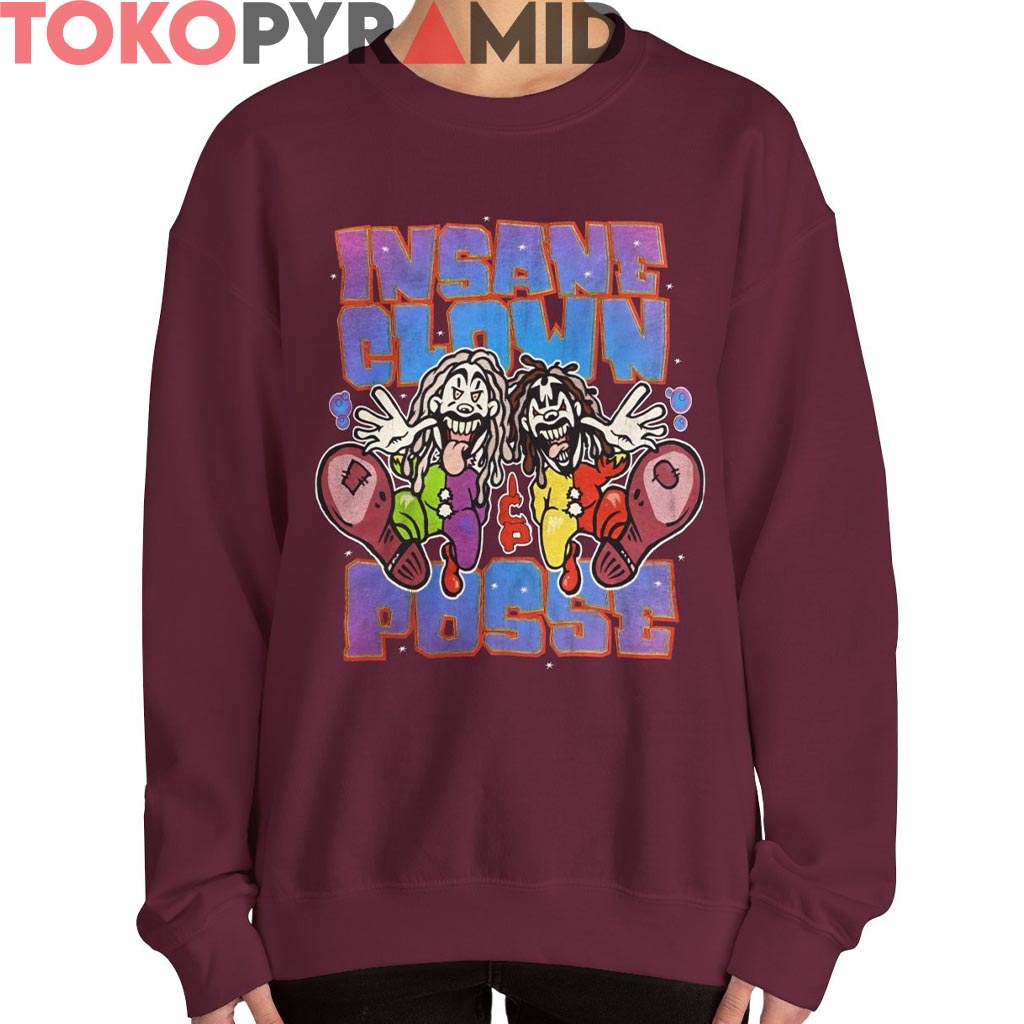 Step into the chaotic carnival that is Juggalo history with the 1998 Insane Clown Posse Juggalo Funhouse Shirt, a tour tee dripping in vibrant, throwback madness. The front hits you with a blast of twisted cartoon energy—Shaggy 2 Dope and Violent J kicking out of the frame with oversized clown shoes and wild-eyed grins, their faces frozen mid-chaos like characters in a demented Saturday morning show from hell. The bubbly “INSANE CLOWN POSSE” text above and below is rendered in saturated, almost neon colors—pure late-’90s flavor.