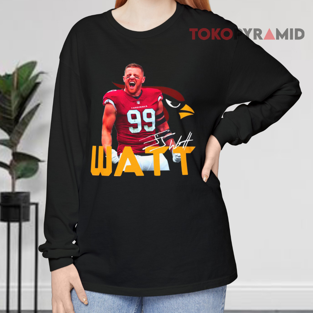 The overall layout balances athletic energy with clean, sharp presentation—perfect for fans of J.J. Watt, Cardinals supporters, or collectors of player-themed apparel. Whether worn casually or displayed with pride, this shirt honors Watt’s career and presence in the league with a bold, visually engaging design that blends player tribute and team pride in perfect harmony.