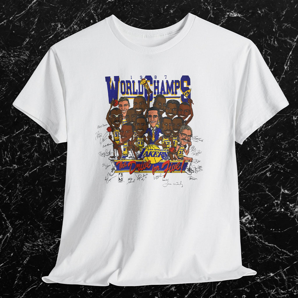 Introducing the “Vintage Lakers 1987 World Champs The Drive For Five Tee” – a tribute to the glorious victory of the Los Angeles Lakers in the 1987 NBA World Championships. This remarkable shirt encapsulates the essence of basketball history and the team’s relentless pursuit of greatness.