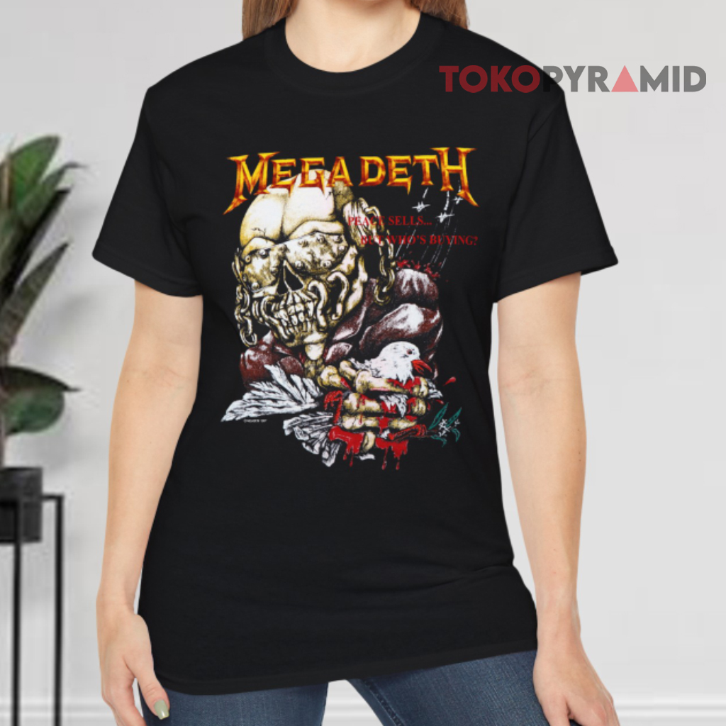 The album cover artwork, which is vividly displayed on the shirt, is a haunting depiction of a menacing, skull-faced figure gripping a helpless white dove. Above this powerful imagery, the name “Megadeth” and the album title “Peace Sells But Who’s Buying” are boldly emblazoned.