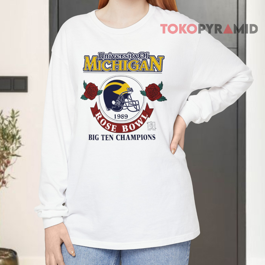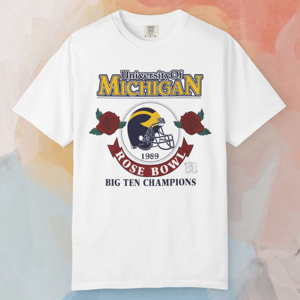 Across the top, the shirt proudly displays the words “University of Michigan”, reinforcing the team’s legacy and dominance in college football. Just below, the eye-catching text “1989 Rose Bowl” is framed by the imagery of roses, paying tribute to one of the sport’s most iconic bowl games. The layout strikes a perfect balance between bold typography and striking visuals, creating a design that radiates school pride and athletic heritage.