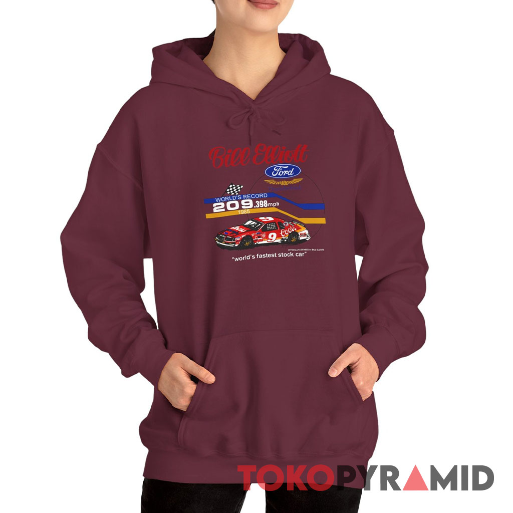 Emblazoned across the Nascar 1985 Bill Elliott T-shirt is an image of Bill Elliott’s race car, elegantly displaying the number 9, with the proud Coors logo adorning the Ford vehicle. The bold and prominent lettering of “Bill Elliott” honors the man himself, while the phrase “World’s Record 209.398 mph 1985” encapsulates a pivotal moment in his career a record-breaking achievement that defined his legacy. And let’s not forget the subtle yet significant touch of “World’s Fastest Stock Car”, a testament to the power and speed that marked his driving.