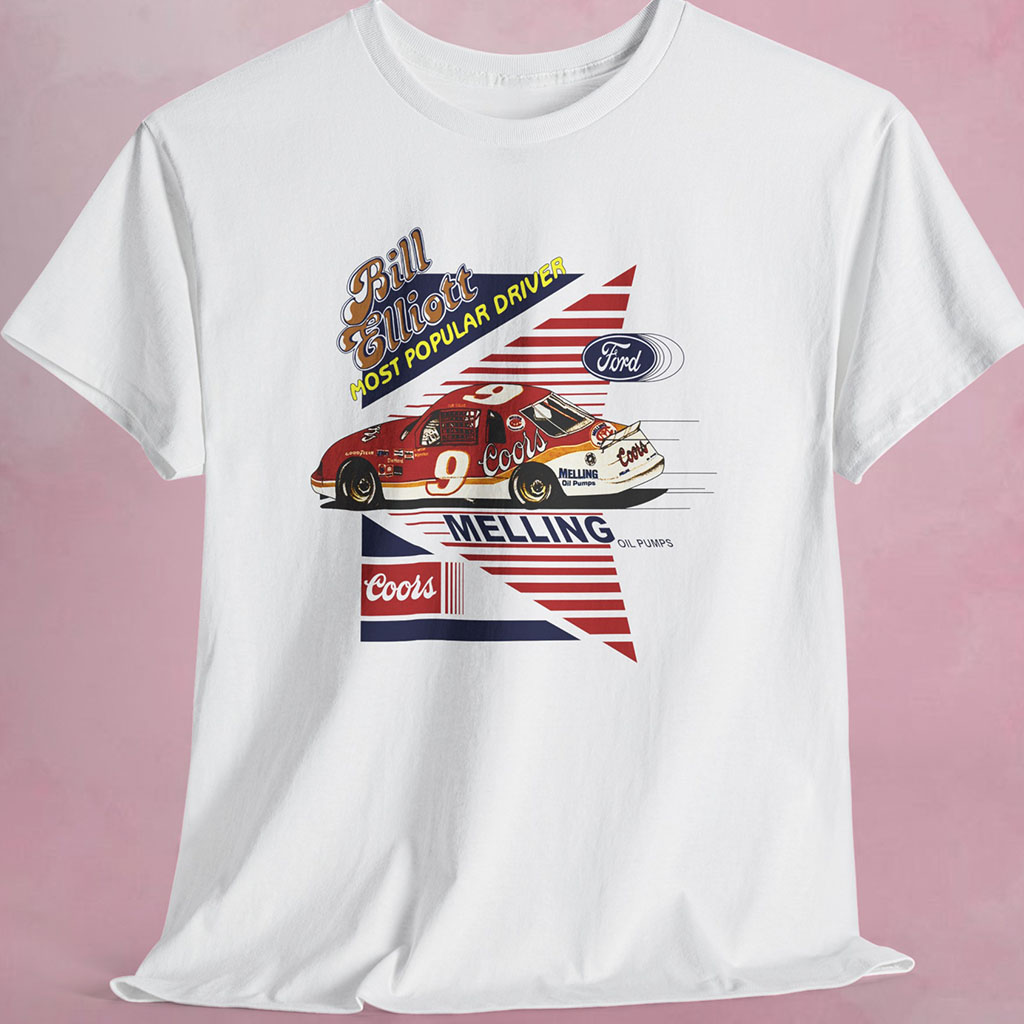 The Nascar Vintage T-shirt proudly showcases Bill Elliott’s iconic #9 car, adorned with the Coors sponsorship, a partnership that left an indelible mark on NASCAR history. Above the car, the text “Bill Elliott Most Popular Driver” stands out boldly, a testament to the deep connection between Bill Elliott and the devoted NASCAR fans who cheered him on throughout his career.