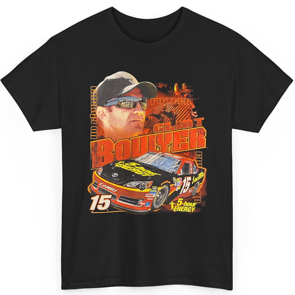 The T-shirt design is a masterpiece in itself. It prominently features Clint Bowyer’s distinct facial expression, emphasized by his signature black sunglasses and cap that exude his determination and focus on the track. The backdrop showcases his race car, elegantly emblazoned with the number 15, a representation of his racing identity. Alongside his car, the 5-hour Energy logo stands proudly, signifying his influential partnership with this renowned brand.