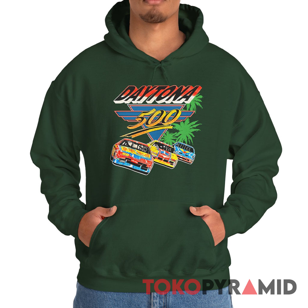 Emblazoned across the front are three dynamic race cars. These vehicles, emulating the spirit of fierce competition, embody the essence of the Daytona 500 – a true spectacle of speed and skill. The words “Daytona 500” are boldly displayed, celebrating the legacy and prestige of this legendary race.