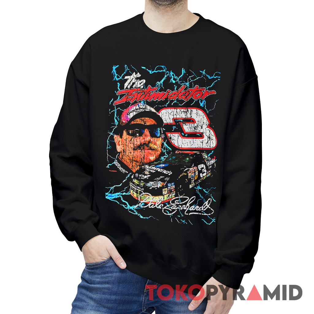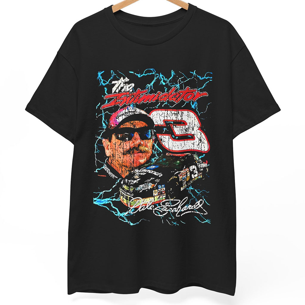 The Nascar The Intimidator T-shirt design prominently features The Intimidator’s visage, complete with his signature black sunglasses and cap, capturing his unmistakable persona. The iconic No. 3 car, synonymous with Dale Earnhardt Sr., takes its rightful place on the shirt, a testament to his remarkable legacy. The backdrop of lightning bolts adds an electrifying visual element, further accentuating the intensity and energy that defined his racing style.