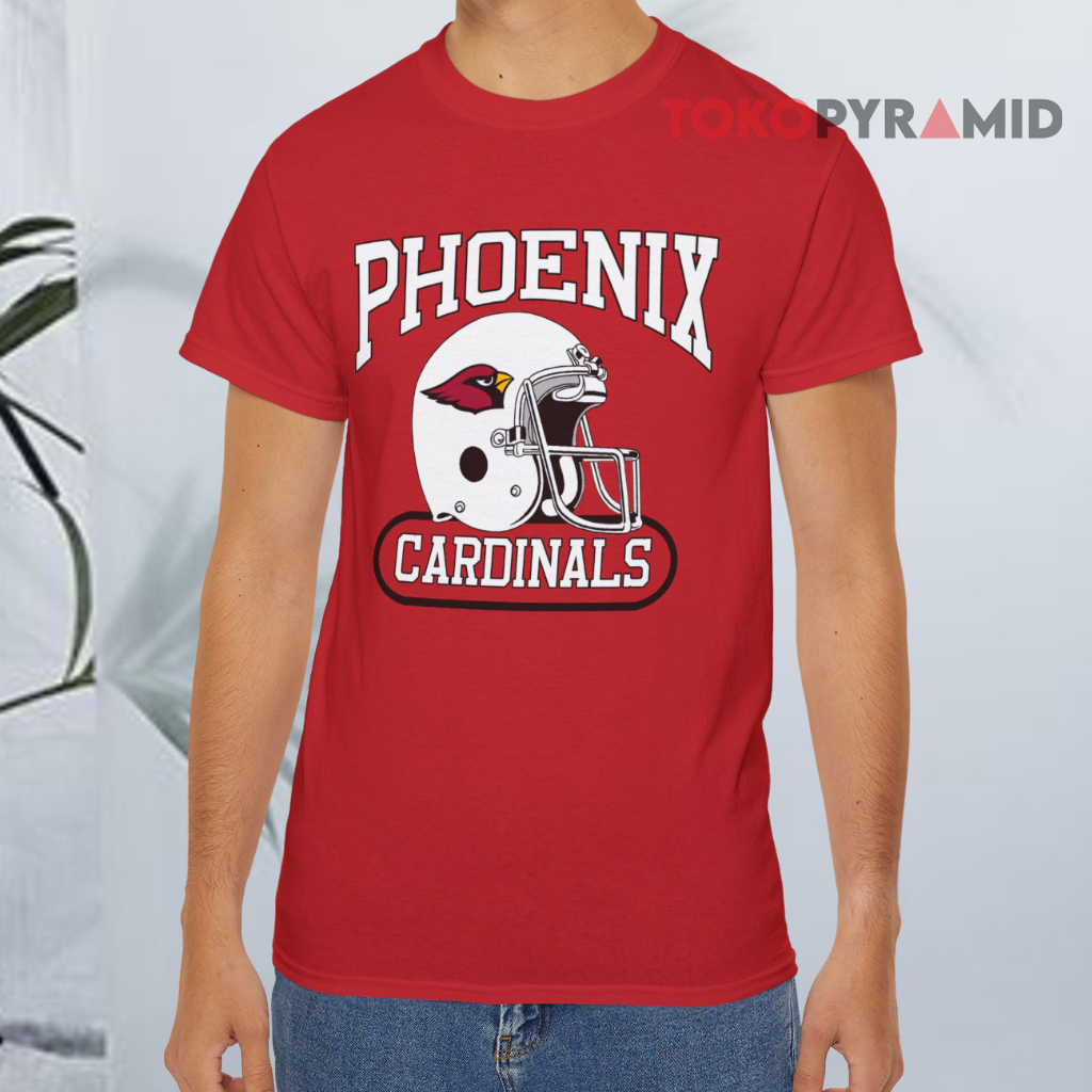 Above the helmet, the word “Phoenix” arches confidently in strong block lettering, giving a sense of pride and presence. Below, the name “Cardinals” balances the composition, using a stylized typeface that reflects the bold, energetic graphic style of 1990s sports apparel. The red, white, and black color palette stays true to the team’s identity while keeping the overall layout clean and visually impactful.