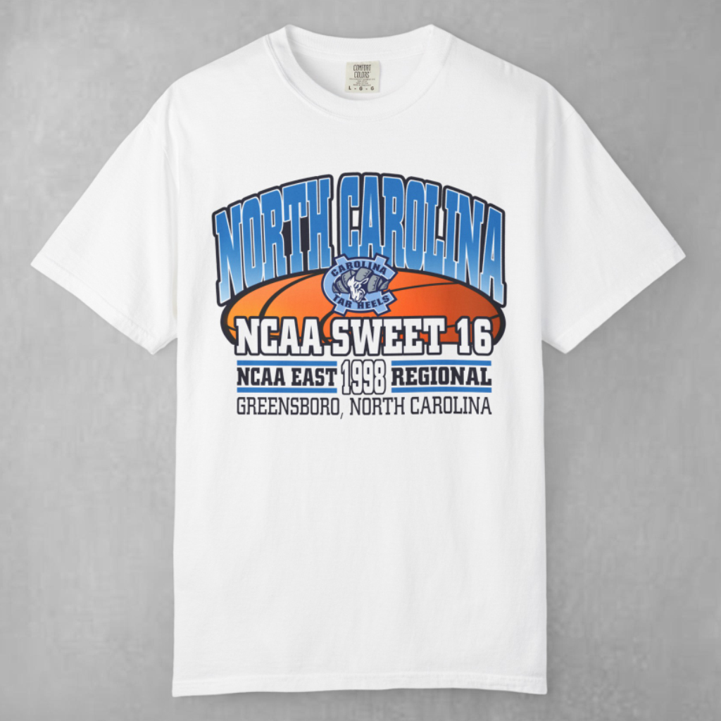Above the graphic, the words “North Carolina” are prominently displayed in collegiate-style lettering, giving the shirt a timeless and spirited look. Below the image, “NCAA Sweet 16” and “NCAA East Regional 1998” are featured in clean, block text, grounding the design in a specific, unforgettable chapter of Tar Heels tournament success. The composition is symmetrical and balanced, giving it a strong visual impact.