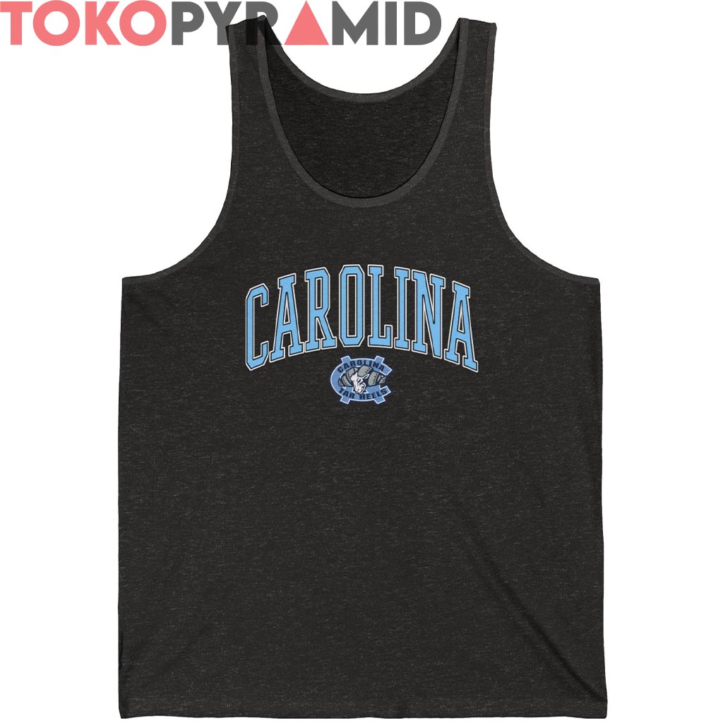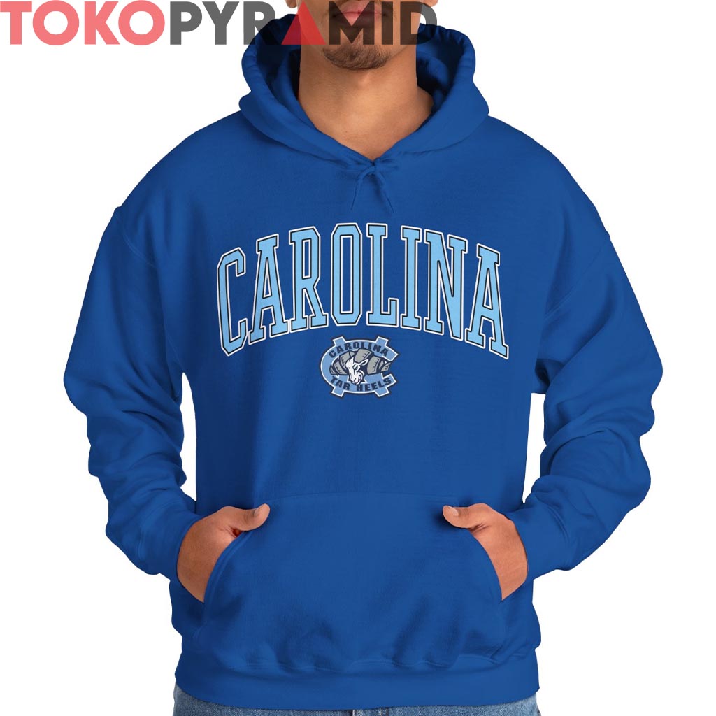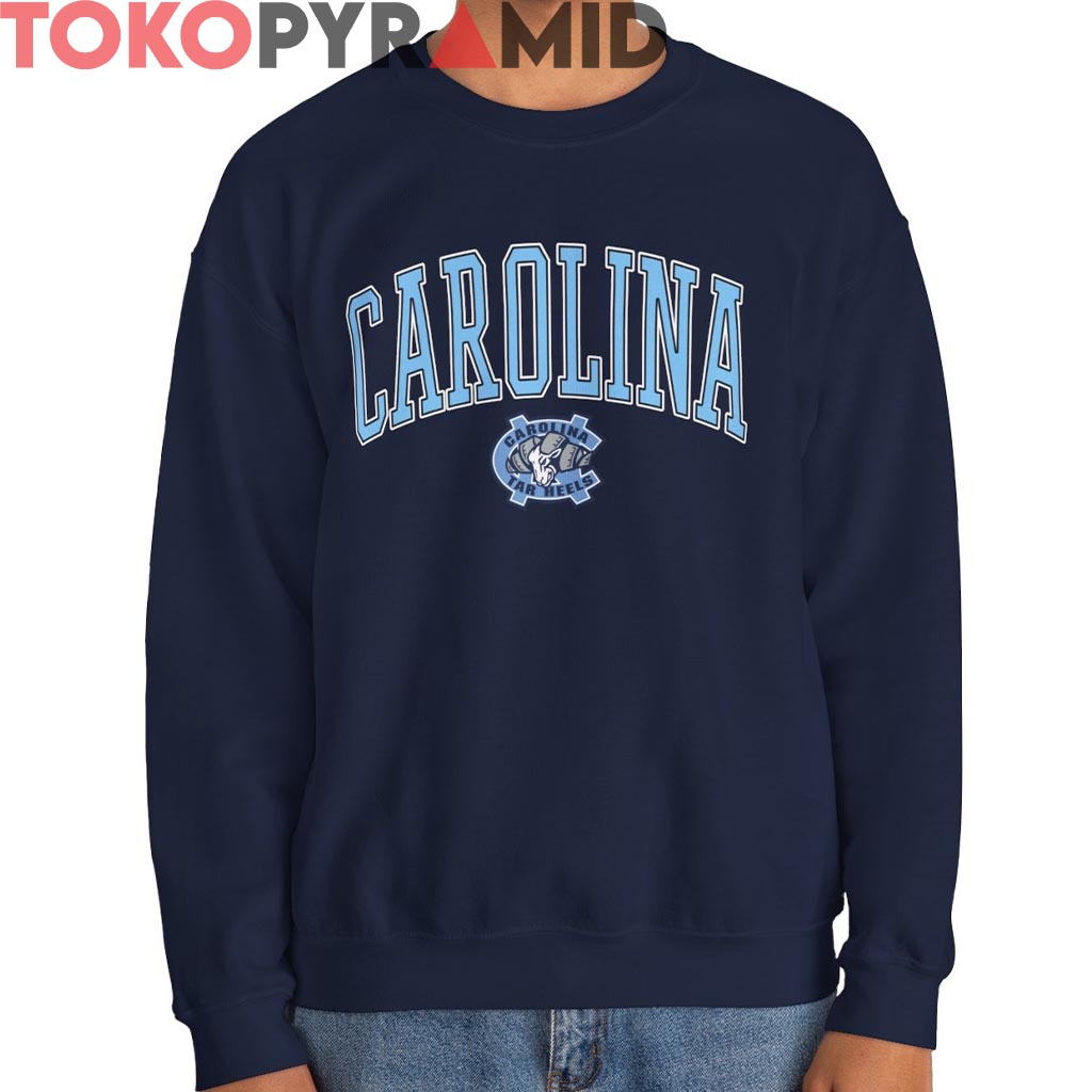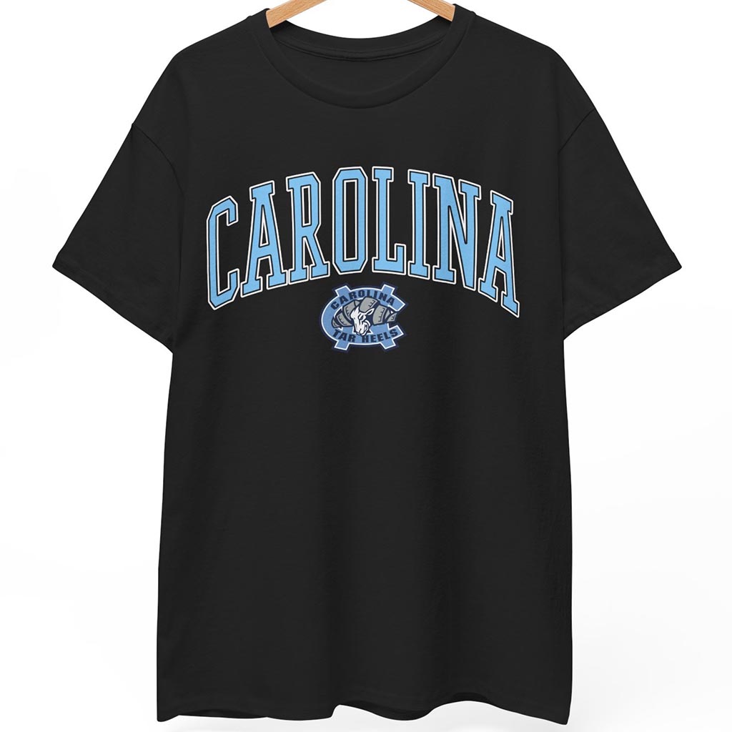 Anchored beneath the arch is a retro Tar Heels logo featuring the determined face of the team’s ram mascot, complete with the nameplate CAROLINA TAR HEELS tucked inside a classic sports crest. The use of icy blue and clean white pops against the darker backdrop like something straight off a ‘90s campus sweatshirt, ready to be worn at game day tailgates or late-night dorm hangs.