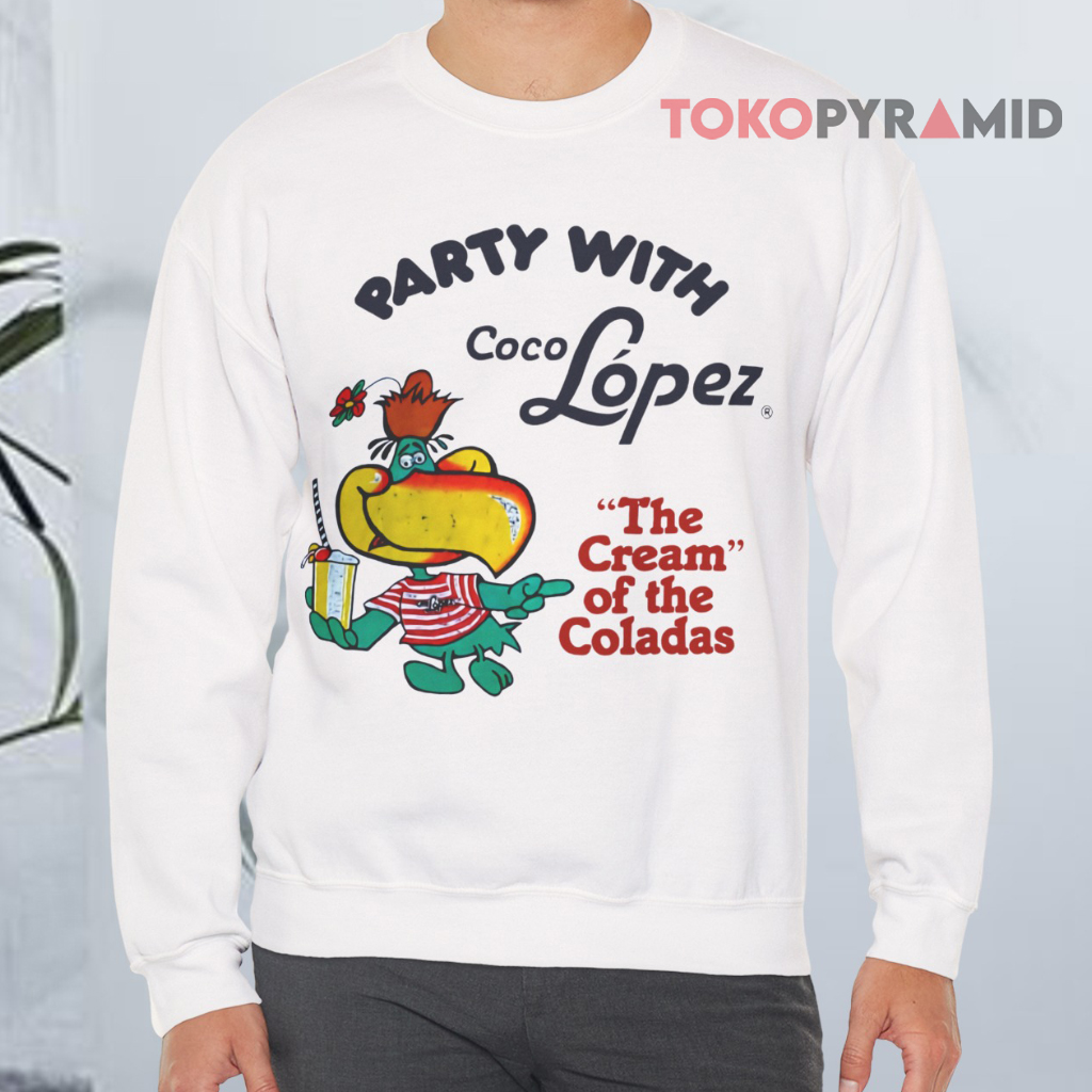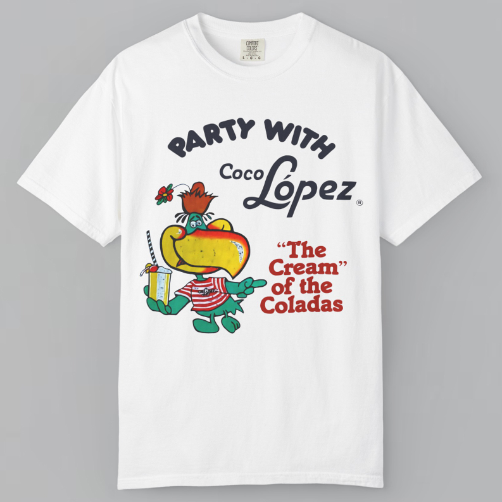 Front and center, the shirt features a cheerful parrot in a rainbow of bold hues, playfully holding a cocktail, capturing the laid-back, festive spirit of paradise. Above the parrot, the words “Party With” set the tone, while the classic Coco López logo below adds a nostalgic, retro touch that evokes memories of sunny days and frozen piña coladas. The phrase “The Cream Of The Coladas” ties the design together with a witty nod to Coco López’s tropical legacy.