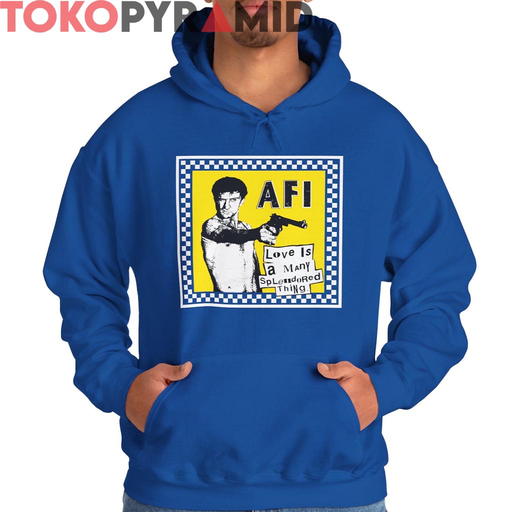 The text “AFI” is punched in punk-stencil typography, anchoring this as an early 90s icon—back when AFI was still clawing out of the hardcore underground. The scrawled ransom-note lettering below reads, “Love is a many splendored thing”, a sarcastic jab drenched in postmodern irony. The whole layout feels like a flyer for a basement show you weren’t cool enough to attend.