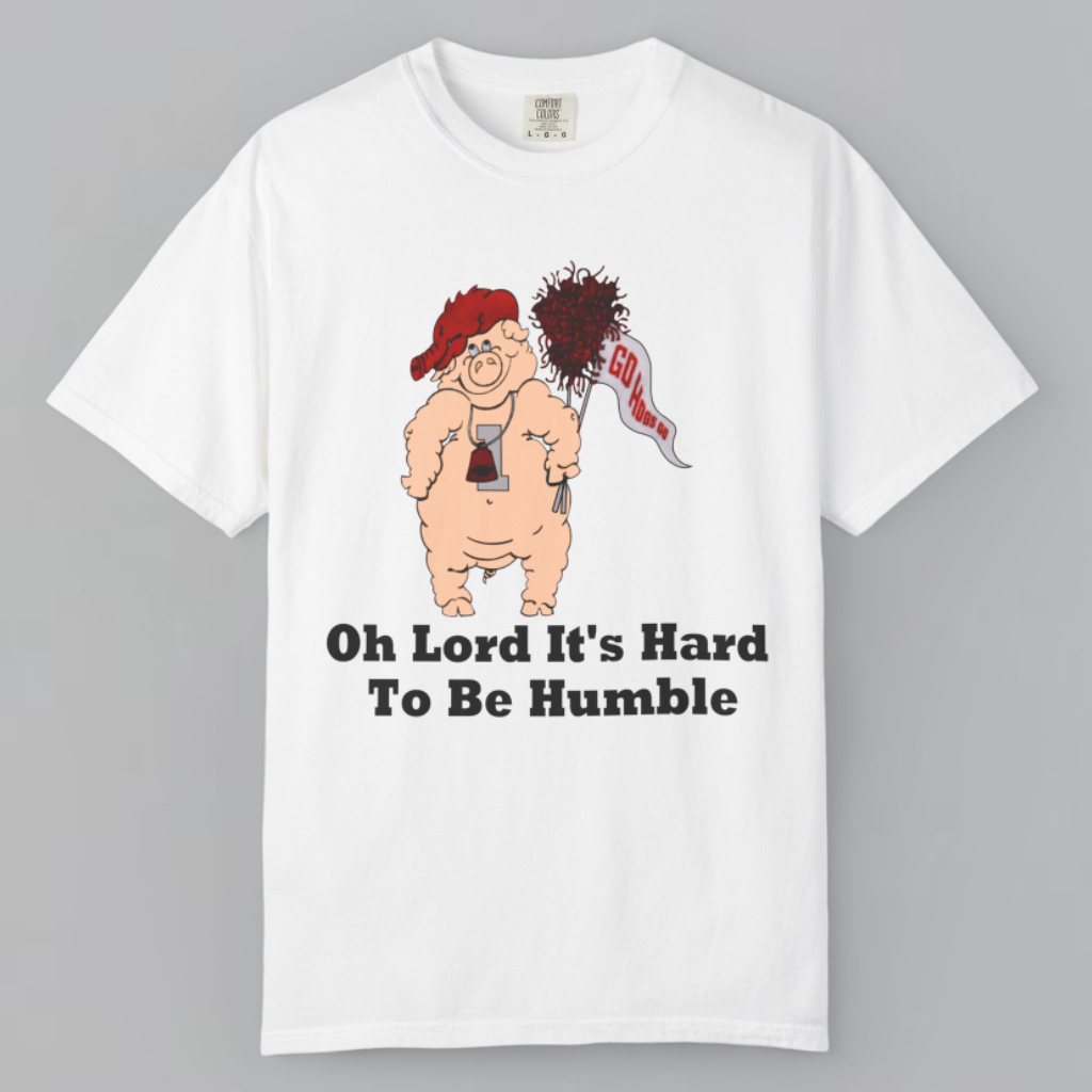 Above the image, the iconic Razorbacks red and detailed artwork of the wild hog give it a classic and spirited look, while the flag adds motion and a sense of triumph to the design. Beneath the mascot, the phrase “Oh Lord It’s Hard To Be Humble” is displayed in a fun, retro-inspired font that blends humor with team pride, making this shirt both bold and memorable.