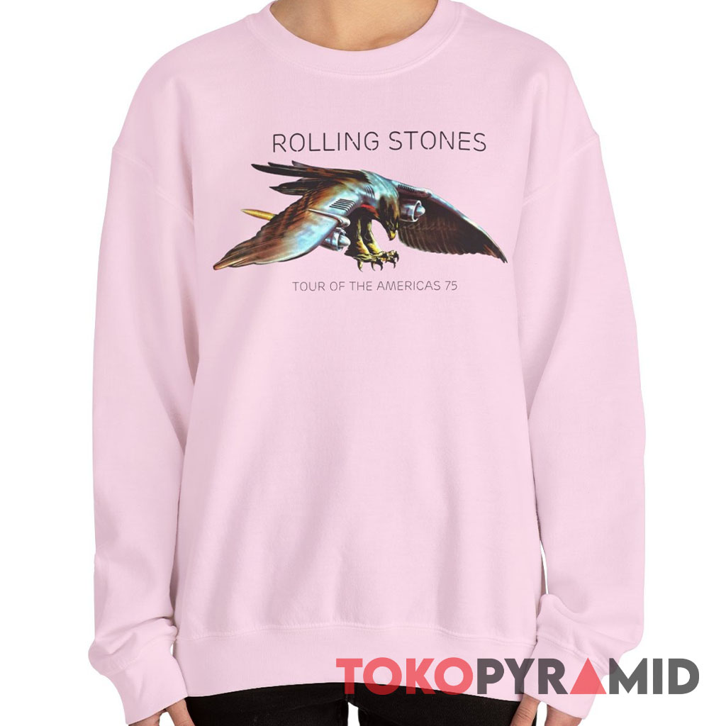 At the heart of this T-shirt lies a symbol that embodies the essence of the Rolling Stones’ monumental “Tour Of The Americas 1975” – the majestic eagle that soared through the skies, proudly displayed on the tour’s original poster. A simple search for “Rolling Stones 1975 poster” online will unveil the striking image of this Rolling Stones Eagle. This design pays a remarkable tribute to that poster, bringing its essence to life on fabric.